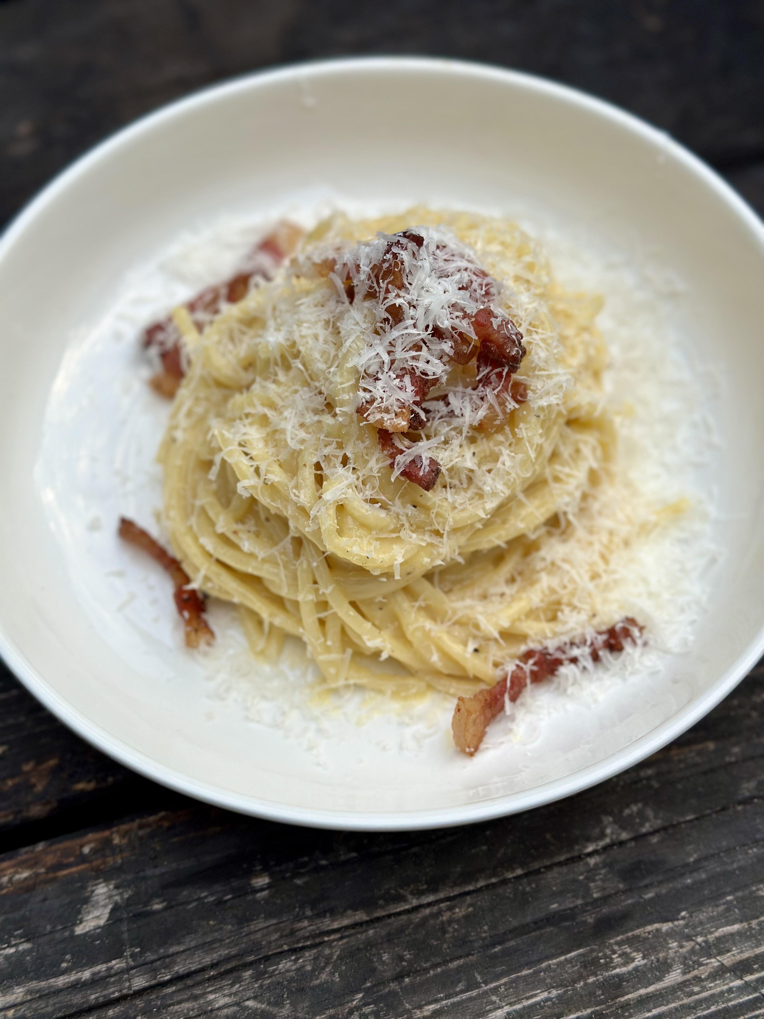 - Add the guanciale back to the pasta, give it one more toss, and serve with some fresh grated parmesan on top.