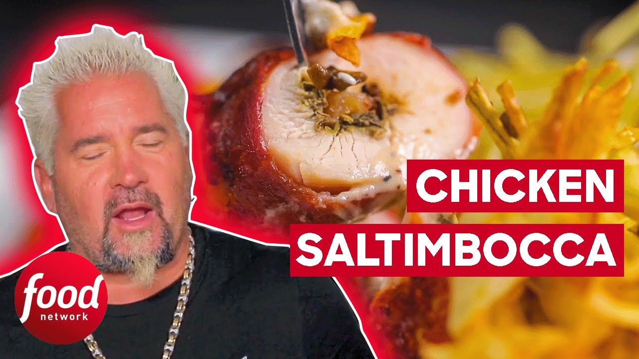 Guy Fieri visits Buffalo, Wyoming, to try a delicious chicken saltimbocca at Pie Zanos. #DinersDriveInsAndDives #FoodNetwork
