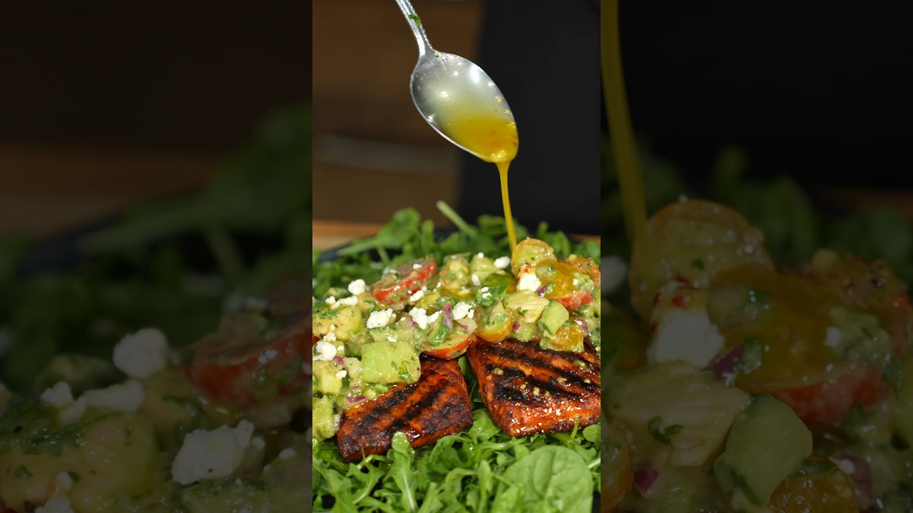 if you struggle eating salads or trying to lower that bited back of yours then I got you and the best part about the salmon salad is it’s an actual salad to make this balm salsa we’re going to start by slicing some avocados next we’re going to chop up some cherry tomatoes add some raw red onions to get that breath kicking add bigger smaller cucumbers we don’t discriminate over here lastly we’re going to garnish it with some cilantro and some dill next have some olive oil some lime juice seasoned with salt I can honestly eat this on its own next we’re going to season up our fish you can use whatever you want I ain’t your daddy and let that cook on the grill for this simple vinegarette we’re going to use olive oil next add some garlic some Dijon mustard some lemon juice then we’re going to add black pepper red chili flakes and salt that’s your easy and delicious vinegarette now assemble your salad I like my greens to be a arugula and spinach add the avocado salsa you can top this with whatever you like I added feta and then finished it with the vinegarette the road to un biging our back starts right here so you know you got to save this one for later