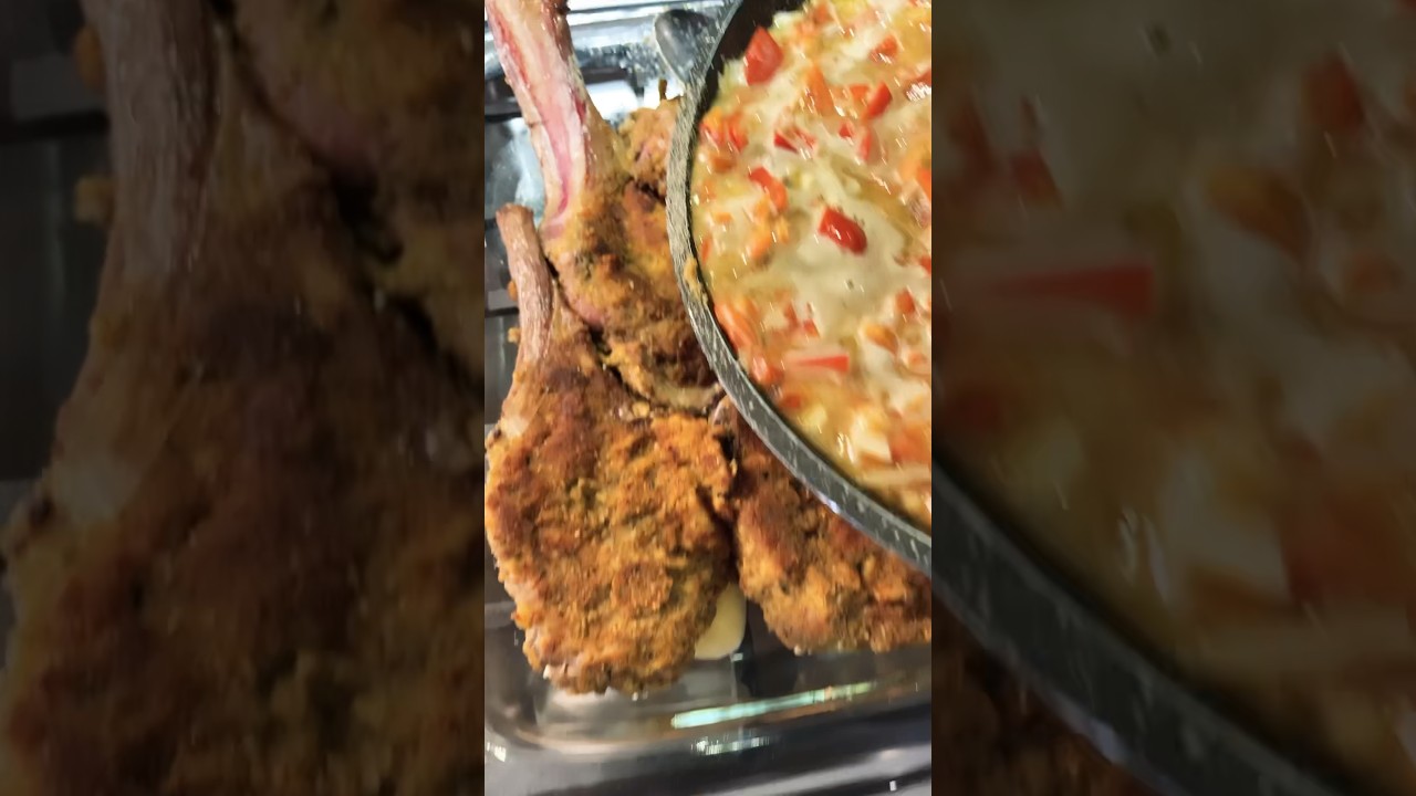 all right stuffed V chops valana a perfect Sunday dinner we got some beautiful V chops we’re pounding them out we got Futo on top couple slices of soft Fontina cheese right into the egg wash then into the breadcrumbs fry it in the butter and olive oil mix 10 minutes each side wine pairing tonight is a chilled pinio Santa Christina the fried F chops in an oven dish but we’re not done yet let’s build the sauce so it’s butter red peppers onion and garlic some white wine little Parmesan regano sauce goes right on top and it goes into the oven about 30 minutes another great Sunday day better