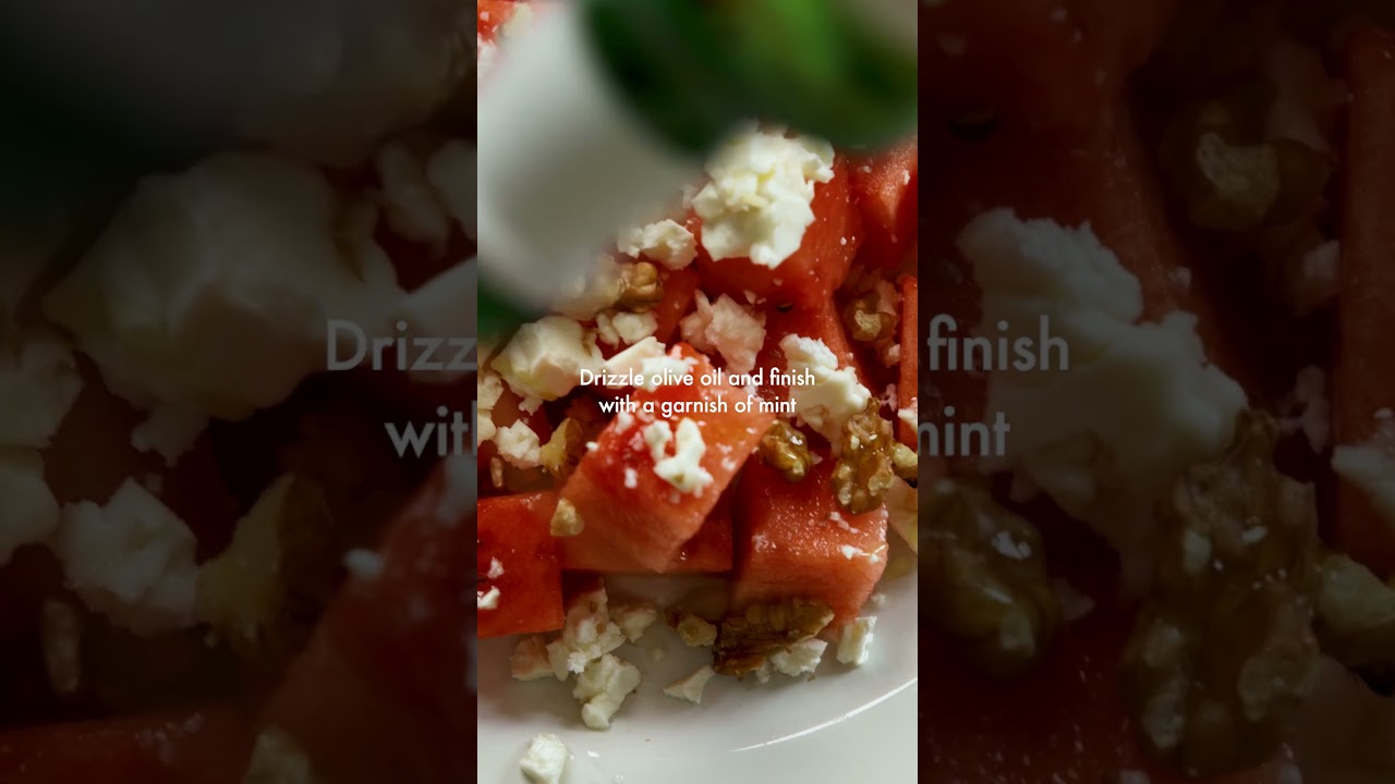 🌿Ingredients: 1/6 of a watermelon, a few mint leaves, 1/2 tablespoon of honey, 20g feta cheese, a handful of chopped walnuts, 1/2 lime, 1 tablespoon olive oil, a pinch of salt