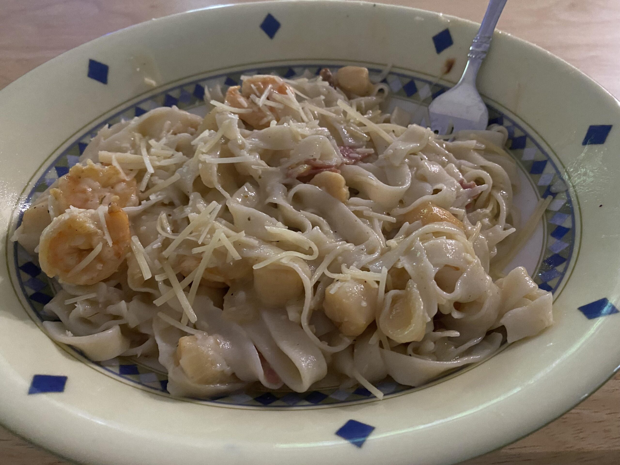 I made some fresh linguine and my husband made a garlic butter carbonara with shrimp and bay scallops. This was my second attempt at linguine and I was very happy with the improvement.