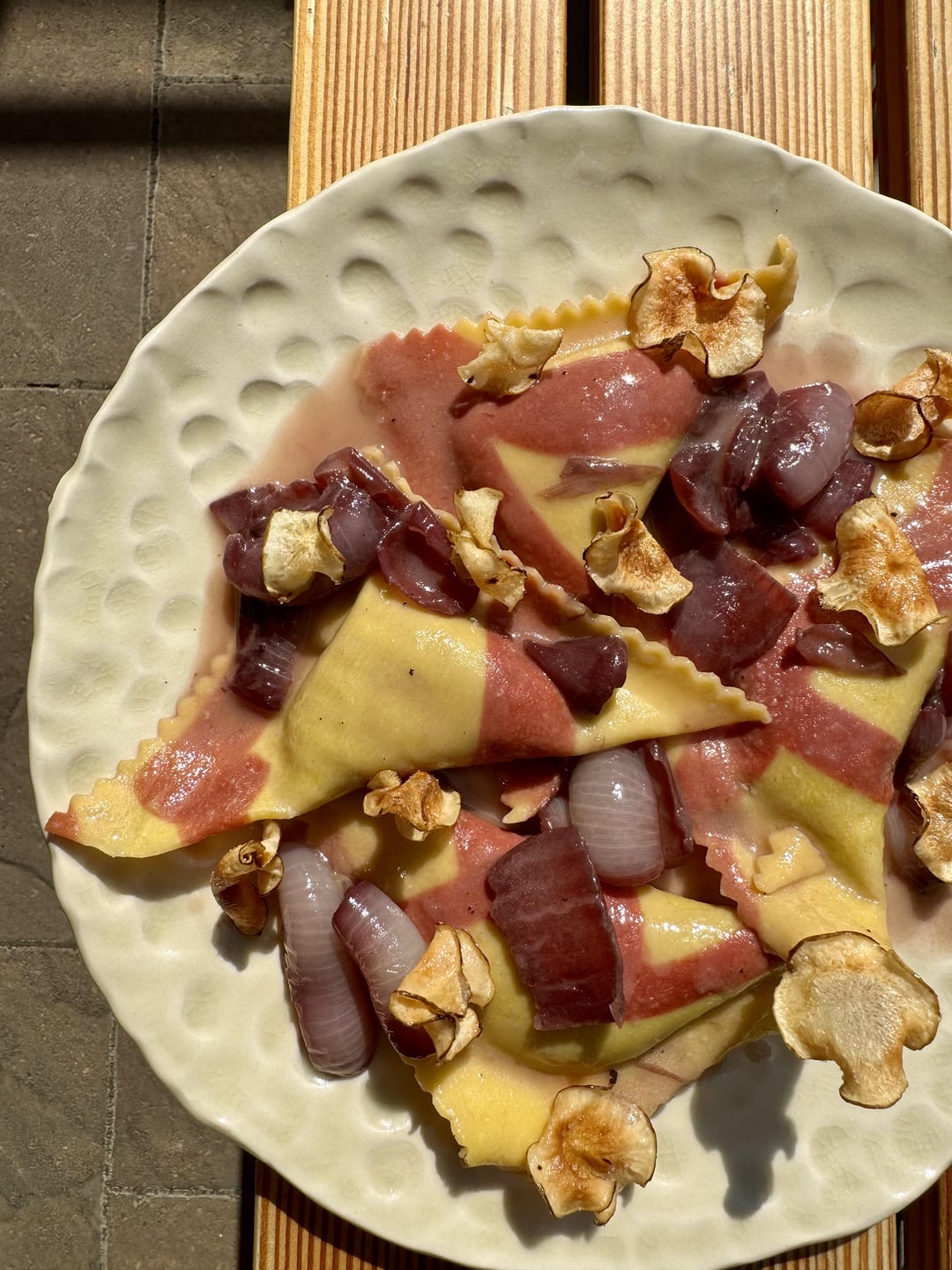 Sunchoke filling, red wine cipollinis, sunchoke chips. Maroon color thanks to some beet powder.by Cautious_Type6474 Homemade Dish - From ScratchPastaWrite A CommentYou must be logged in to post a comment.