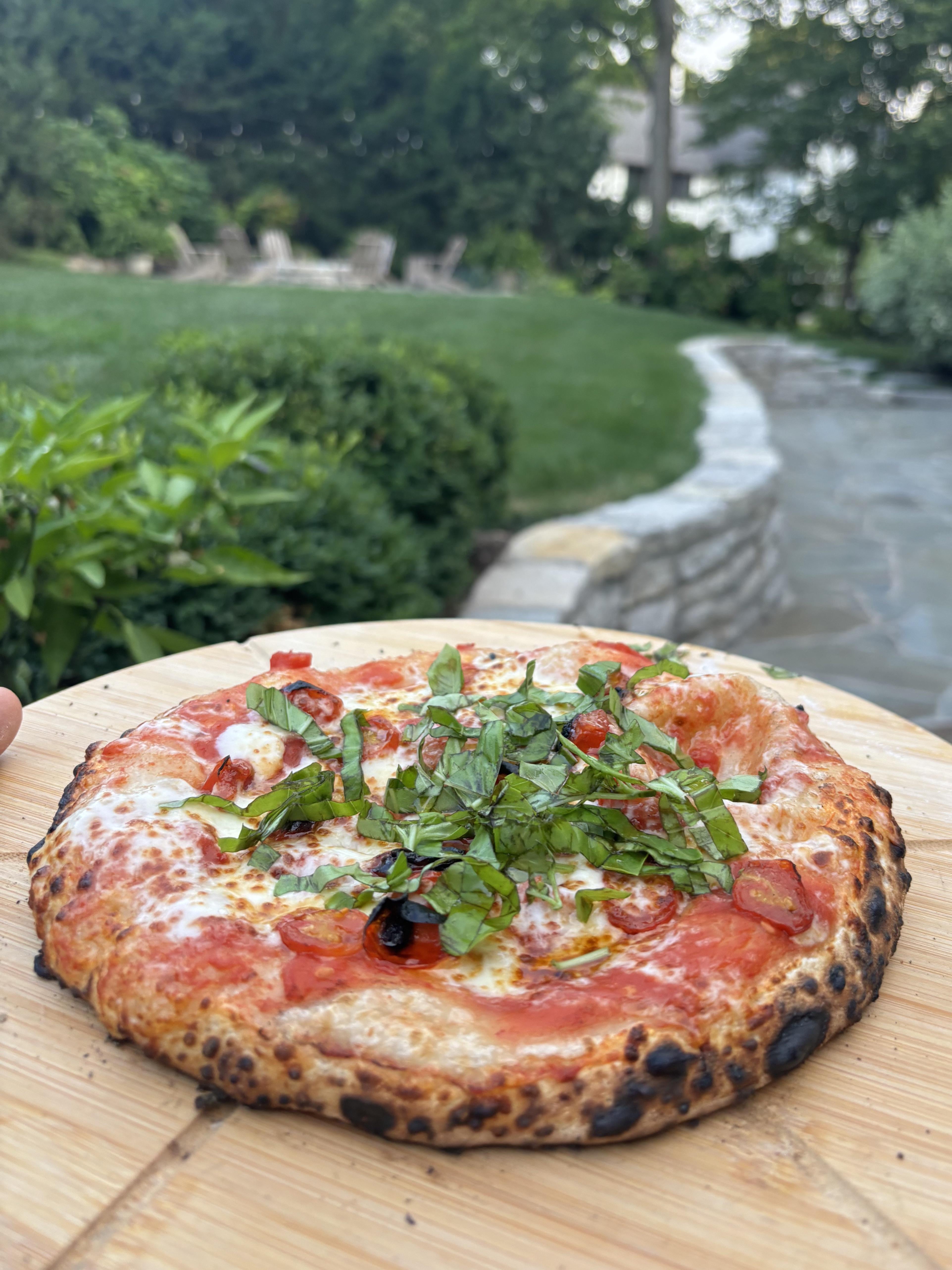 I’ve been making pizza with a 12” Roccbox pizza oven for about a year now and have slowly gotten better. I usually buy pizza dough from a gourmet pizza place, they use sourdough starter so the flavor is great but it can be hard to shape compared to my dough. I make my own pizza dough on weekends if I can.