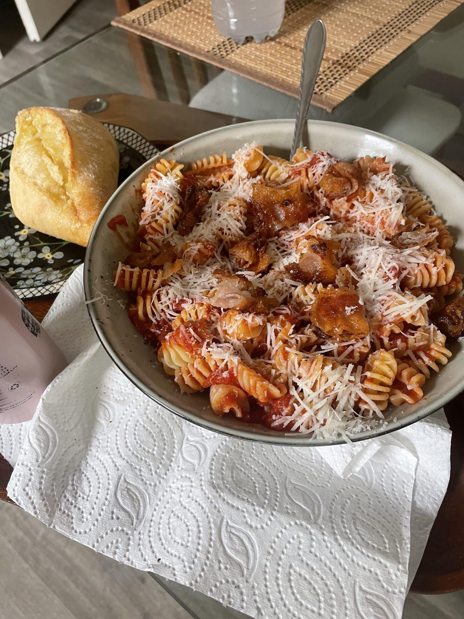 This dish tasted absolutely amazing. Originally I tried to keep it original but my grocer didn’t sell bucatini or whole guanciale so I settled for strips of it (still worked). Before making this dish I had never deglazed the pan before and oh my did it make the sauce amazing. Love the chilli as well.