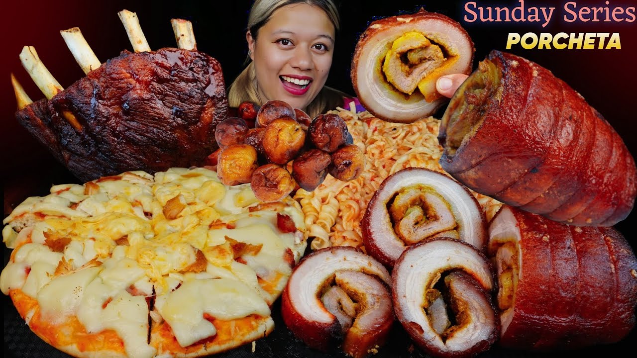 Hello everyone welcome to Mukbang Pari. Today I am going to eat Italian food cheesy chicken pizza, spicy creamy and cheesy pasta, rolled pork belly (porchetta), pork ribs and fish balls. Ihope you enjoy watching today’s Mukbang video.