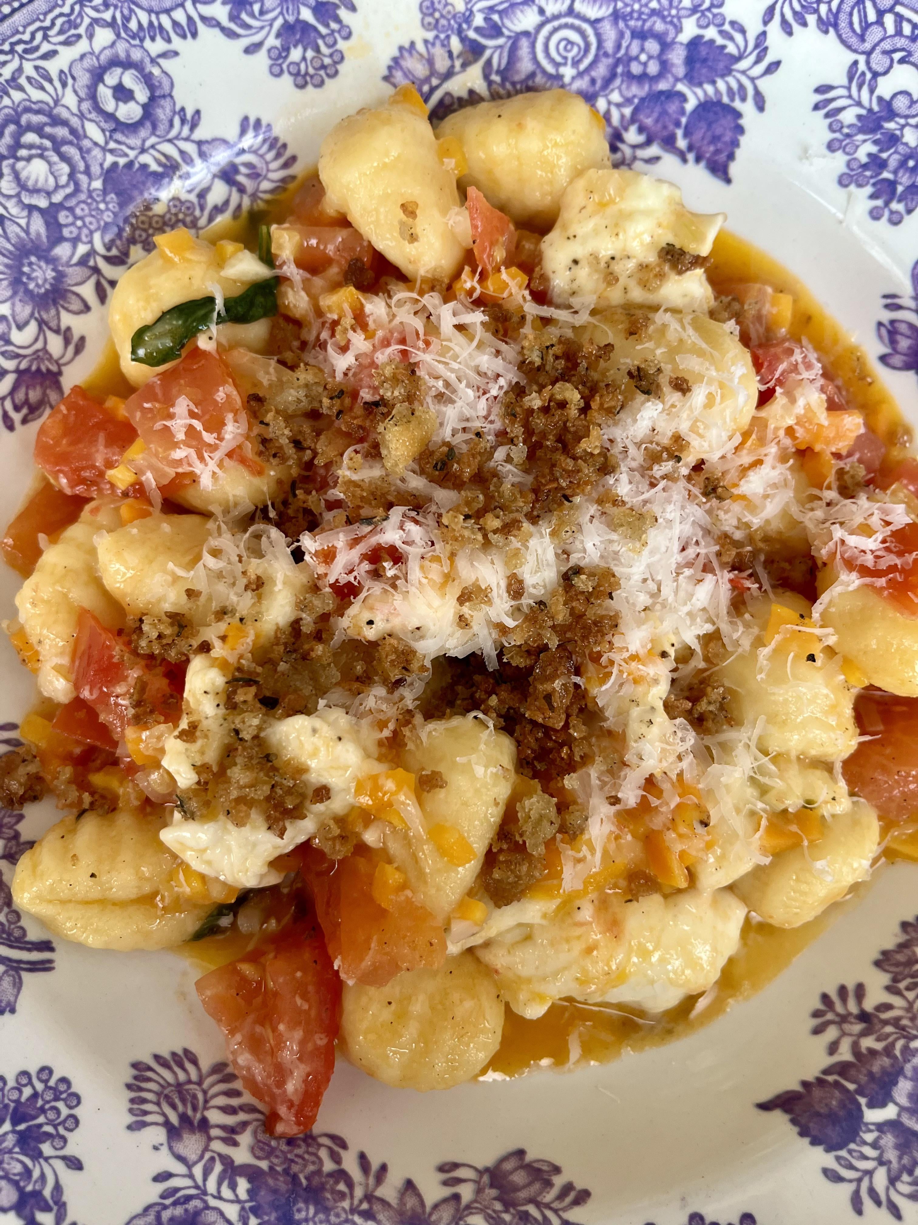 Made some gnocchi and ate it with a sauce of finely diced carrot, shallot, garlic, white wine, fresh tomatos, Parmigiano and basil. Topped it with Parmigiano, mozzarella, fried breadcrumbs and zested frozen tomato. Was summer-ish and delicious 🤌🏼