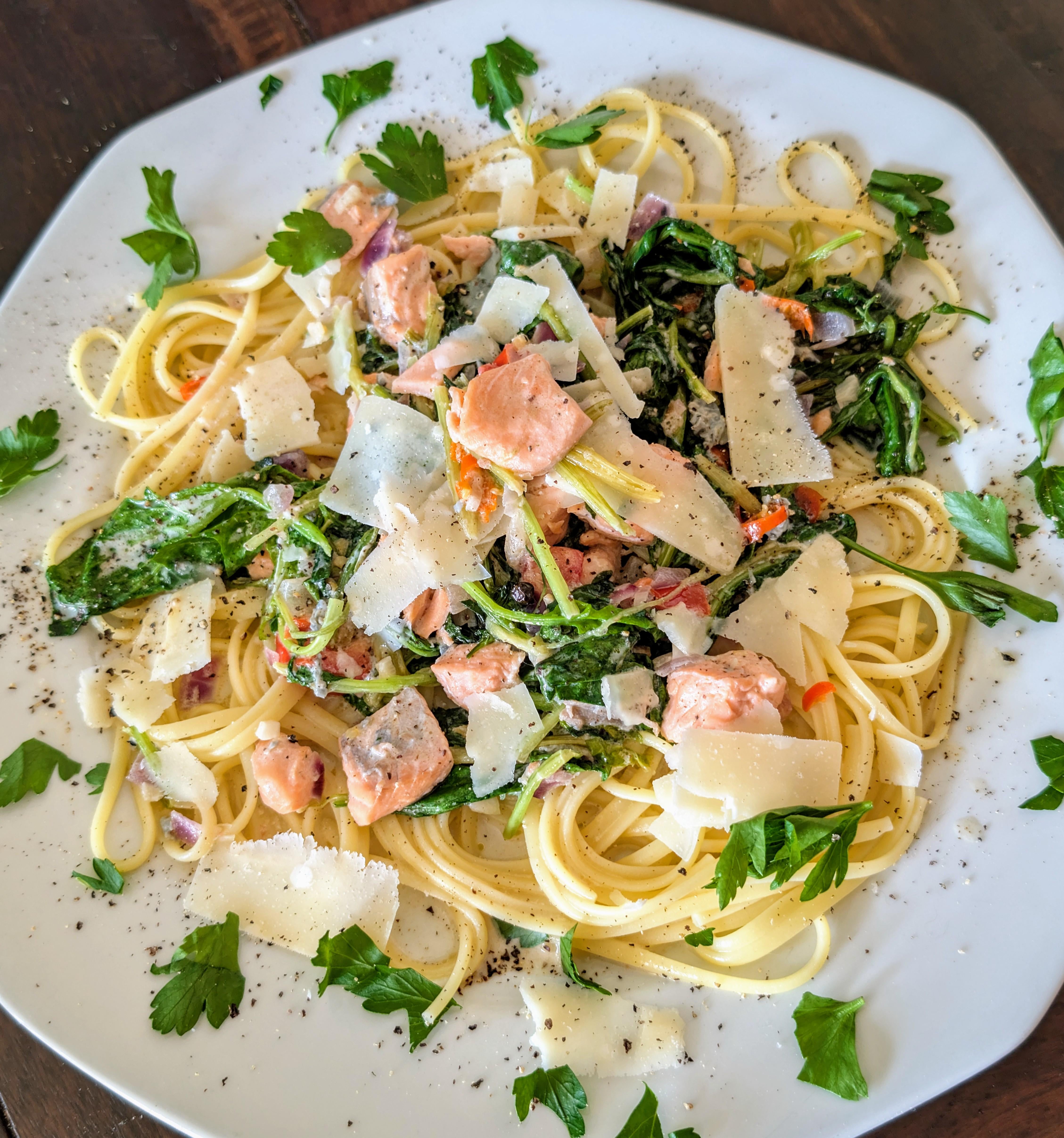 Creamy Salmon in White Wine with Garlic, Chili, Gorgonzola, and Fresh Herbs