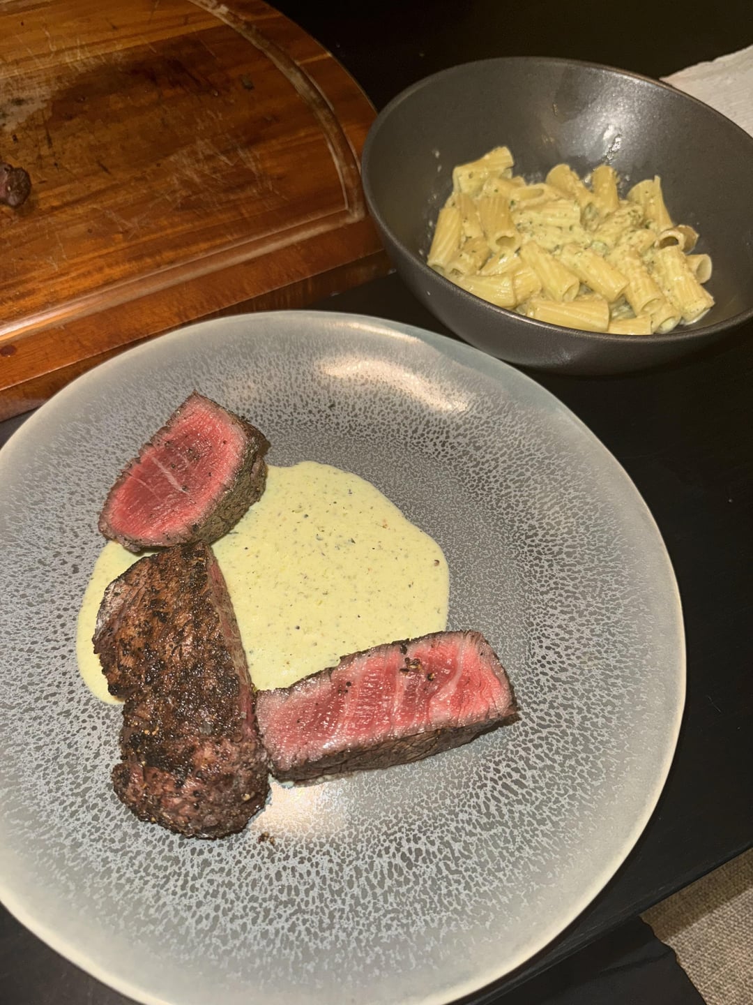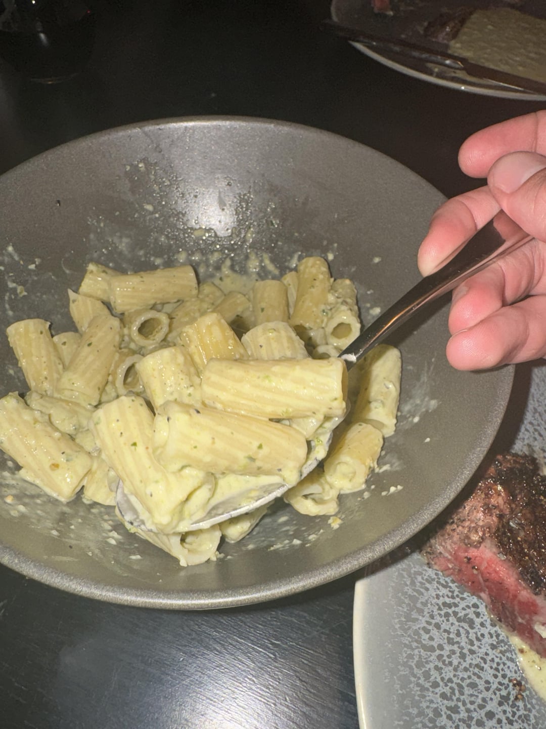 I added a few roasted tomatillos and hatch chilis to the sauce, and made my pesto with pistachios instead of pine nuts. Also opted for steak instead of diced guanciale. Really a fantastic use of chilis that I never would have considered myself. Many props to u/Winter-Pumpkin2127