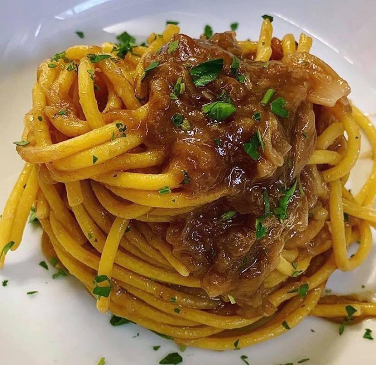 This is my bigoli in salsa. a simple typical dish of Venice. bigoli are a very large fresh pasta that requires quite a long cooking time. for the rest, two ingredients are enough: lots of white onion and salted anchovies. the onions should be cut very thin and cooked for almost an hour with clean anchovies.