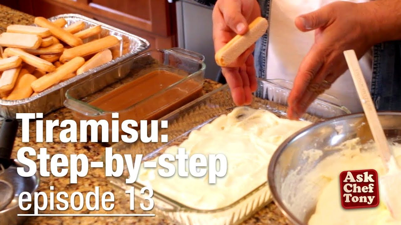 Tiramisu is a traditional Italian dessert. It requires no baking. It’s mostly a technique of beating, mixing, and assembling, using some cookies ( lady finger cookies ) and some eggs, yolk and whites separated, mascarpone cheese ( similar to cream cheese ) espresso or coffee, sugar, cinnamon, chocolate, etc. Did you know, according to most accounts, it was invented in a brothel? Tiramisu literally means “pick me up” or “pull me up”. That’s what it was intended to do for the clients. Despite it’s sordid past, it’s well loved around the world, and not so difficult to make. Chef Tony will walk you through it in this video recipe and also tell you a little about it on the way. Enjoy!