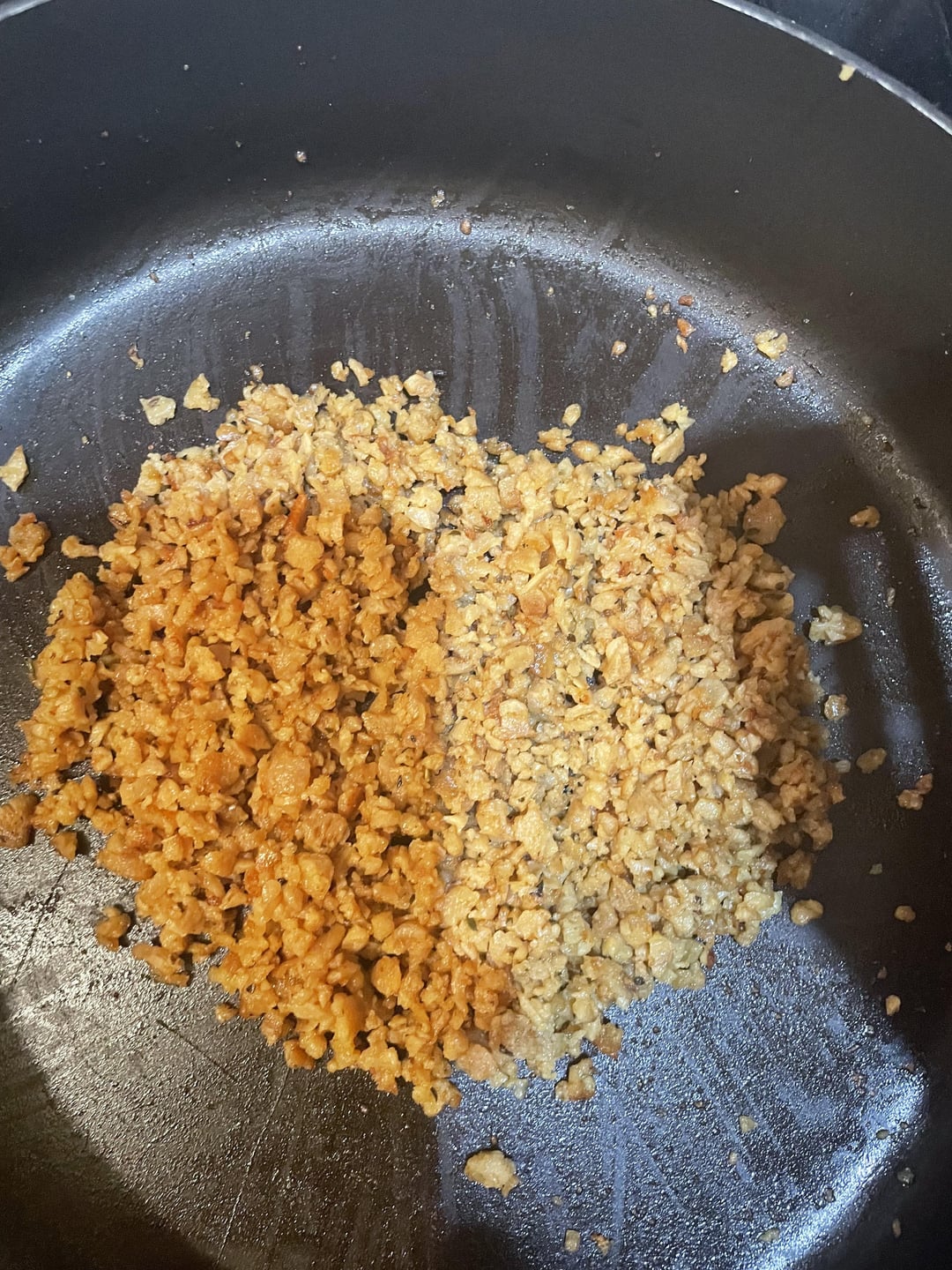 Rehydrate TVP with warm Water, balsamic, soy sauce, garlic powder, onion powder, Italian spice blend. After 15 min, fry off in some olive oil.