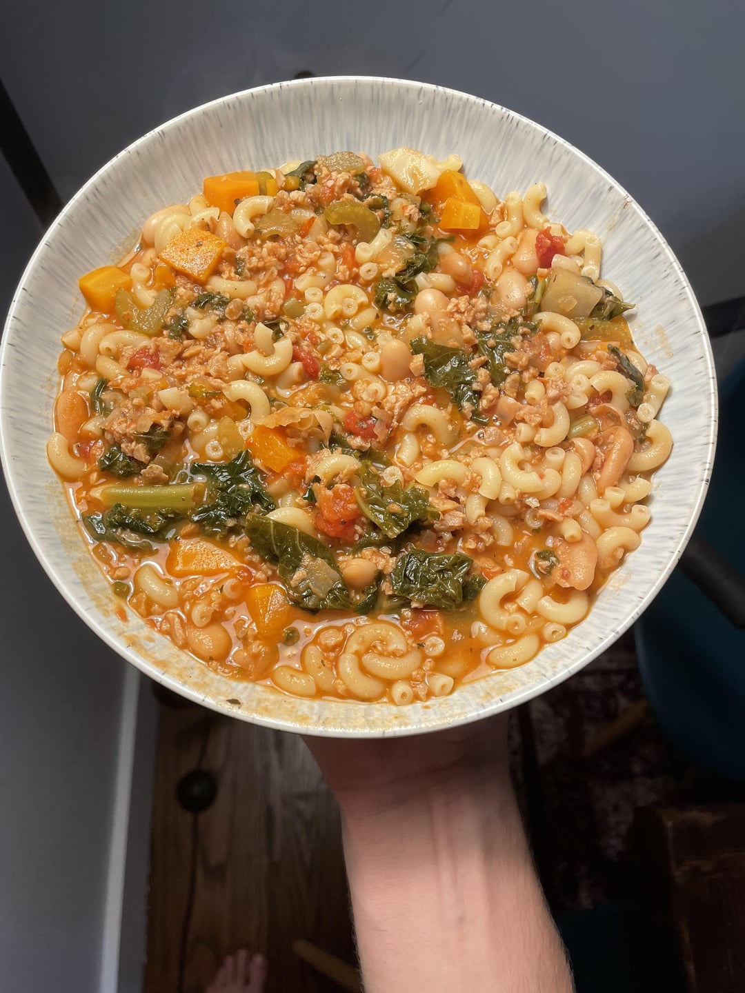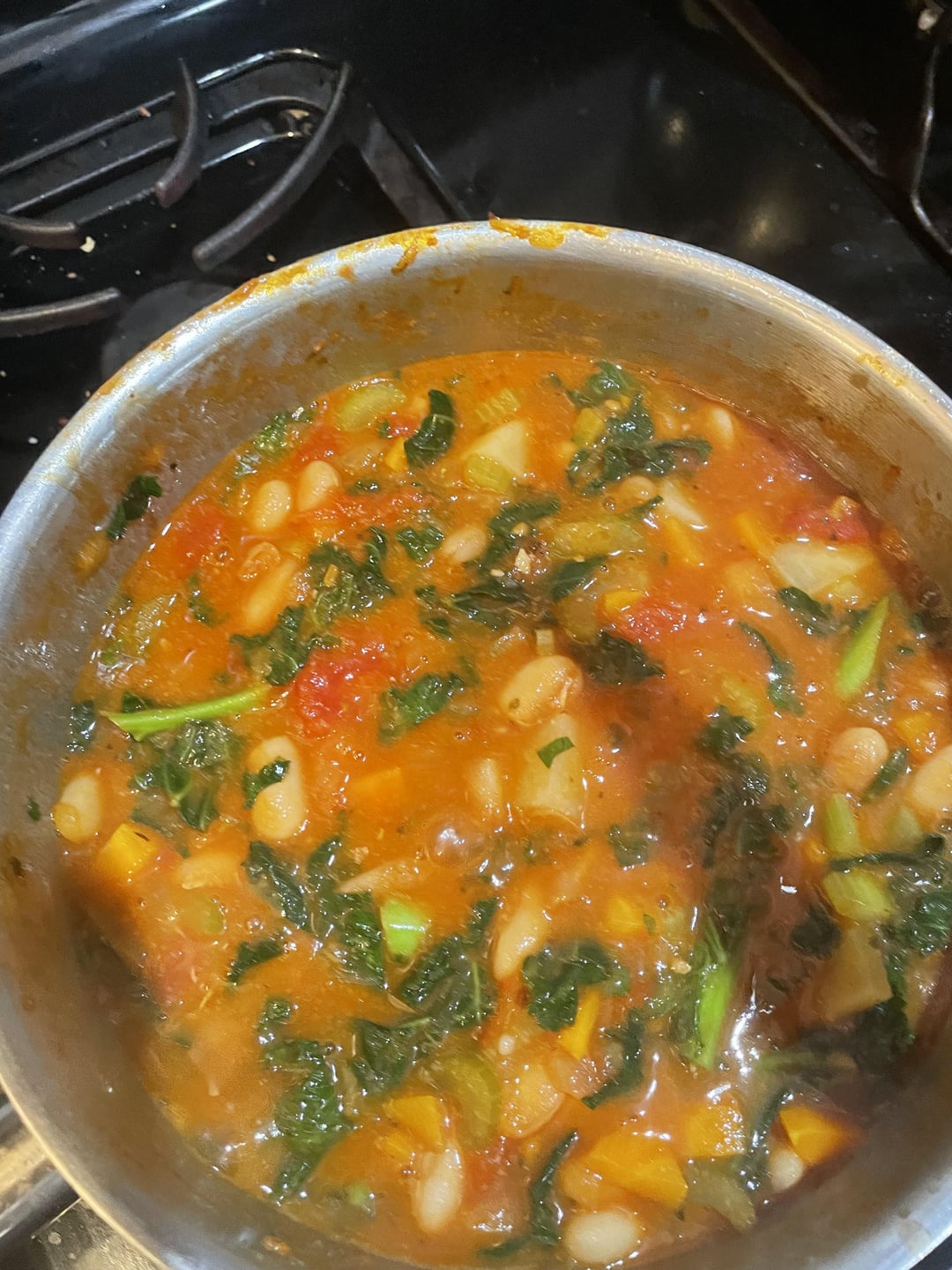 Sauté down onion, then carrot & celery, add crushed tomato out of a can with the juice, 1 can rinsed cannellini beans, fill up your pot with water or veggie stock, simmer down. Add shredded kale.