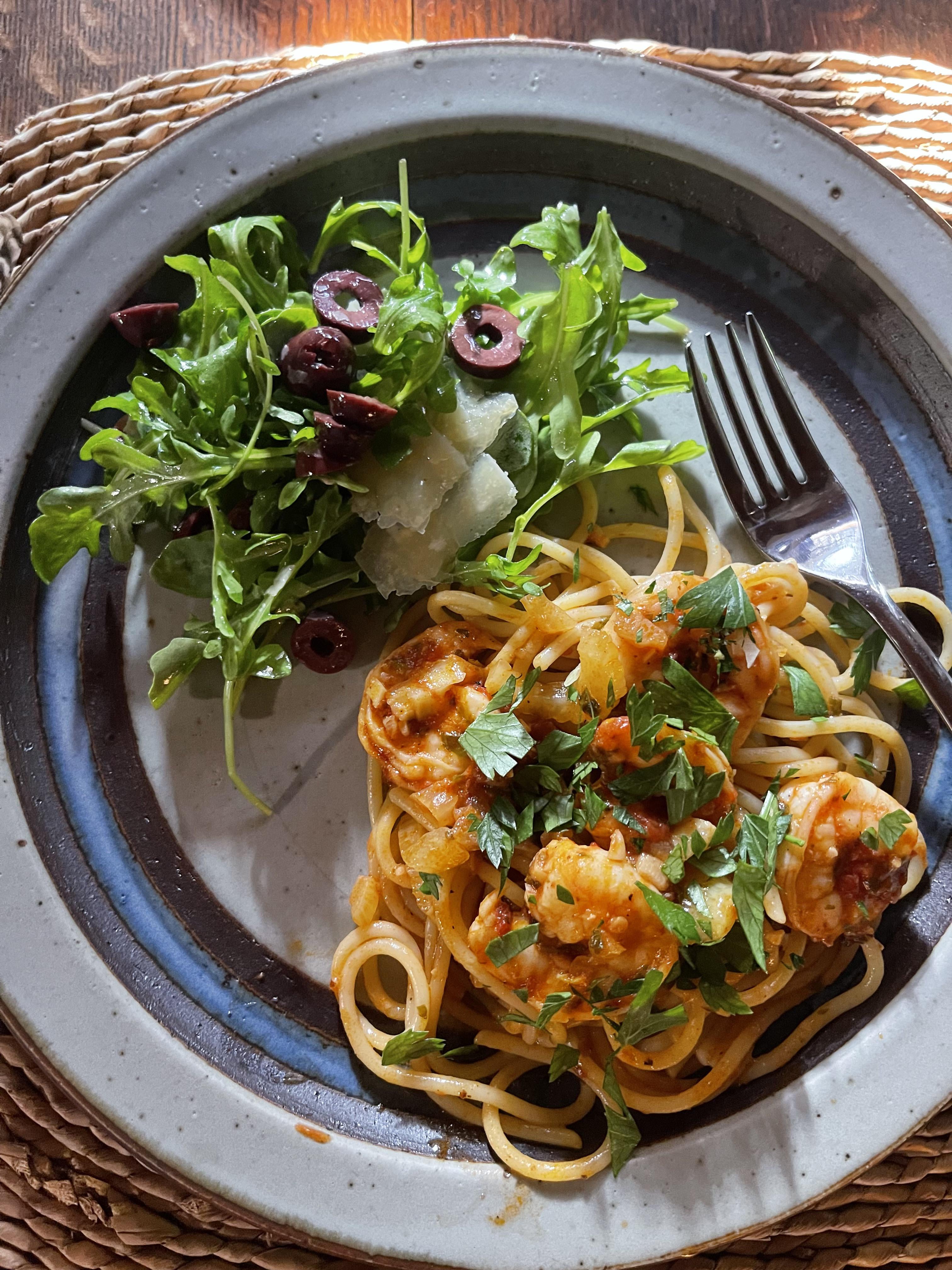 shrimp spaghetti in an eggplant marinara sauce topped with fresh basil, arugula salad with Parmesan cheese and Kalamata olivesby princess-f33t Homemade DishPastaWrite A CommentYou must be logged in to post a comment.