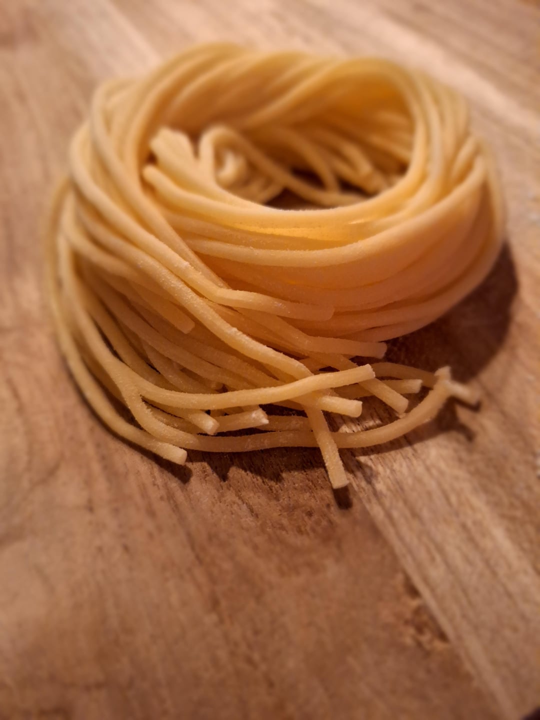 Spaghetti is homemade with typo 00 flour and eggs from my backyard chicken and a little water.