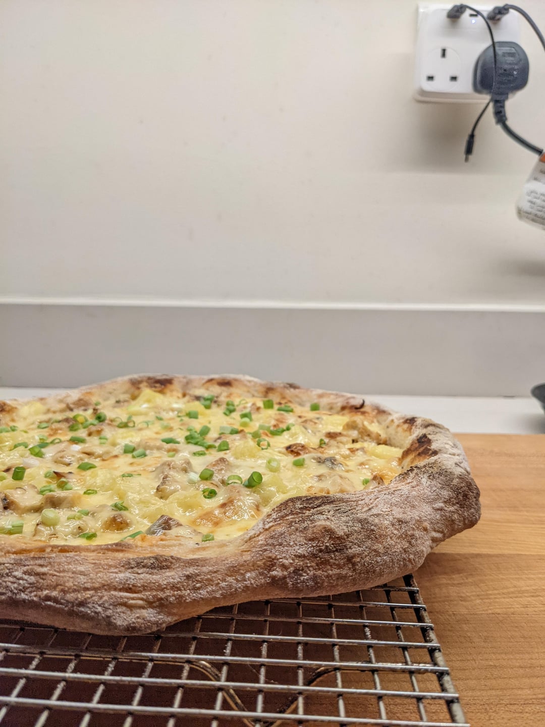 Before baking I take the dough ball out and let it come to temp at least for 1 hour. Bake in 260c oven on baking steel, 5 mins on pizza screen then remove the screen and turn on the broiler for 5 more mins.