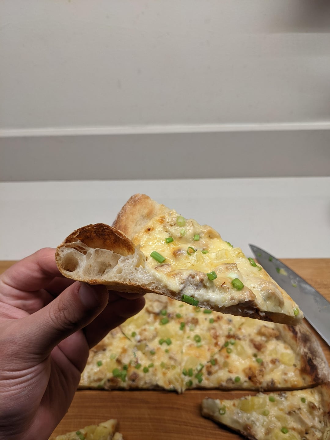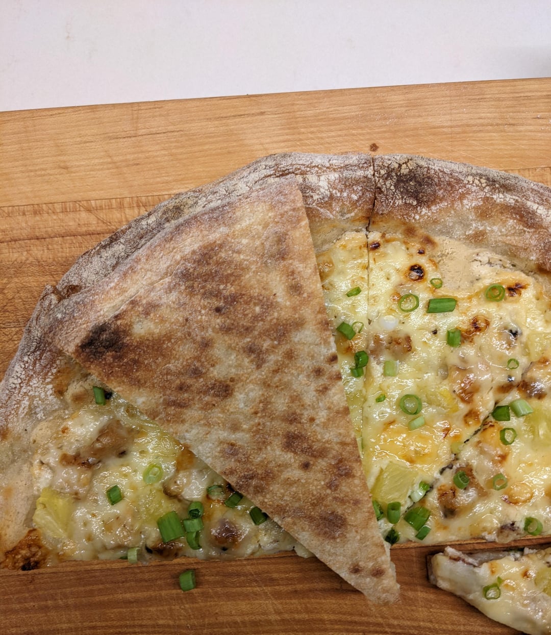 Pictured is ricotta white sauce, grilled chicken breast, pineapple and green onions. Toppings don't matter much for me, I think pizza crust taste is more important than toppings.