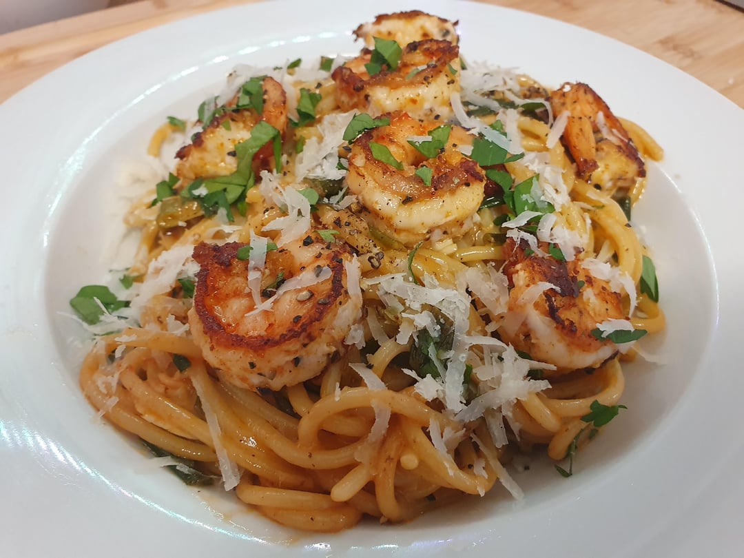 Sauce was made by deglazing the shrimp pan with lots of brandy and a bit of white wine, reduced until thick. Then I added the stock and cream and the spring onions about 5 mins before serving.