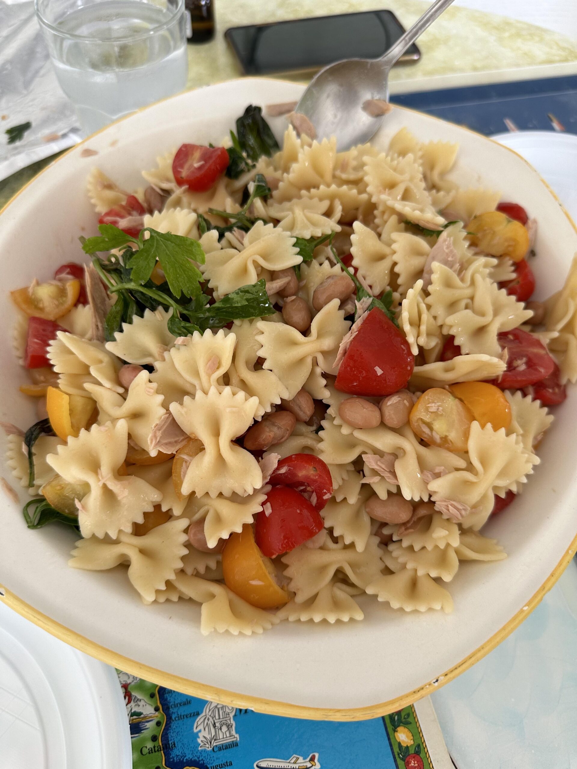 This is a dish that not many of you will understand, but some of my fellow Italians surely will. A dish made for hot days and enjoyable even when it’s cold, farfalle al dente with tuna, cherry tomatoes, beans and parleys, with lots of olive oil.