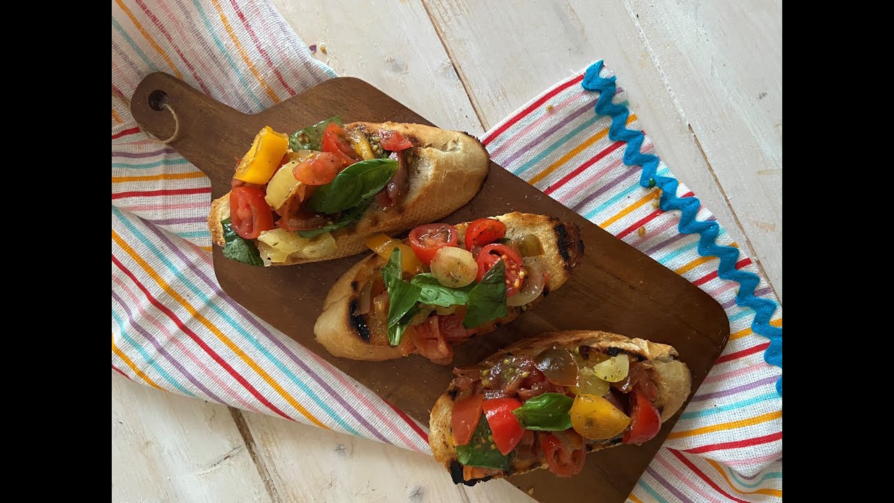 Bruschetta is an antipasto from Italy, It is grilled bread rubbed with garlic, drizzled with olive oil and then topped with then topped with chopped tomatoes, basil and a seasoned with olive oil herbs and spices.