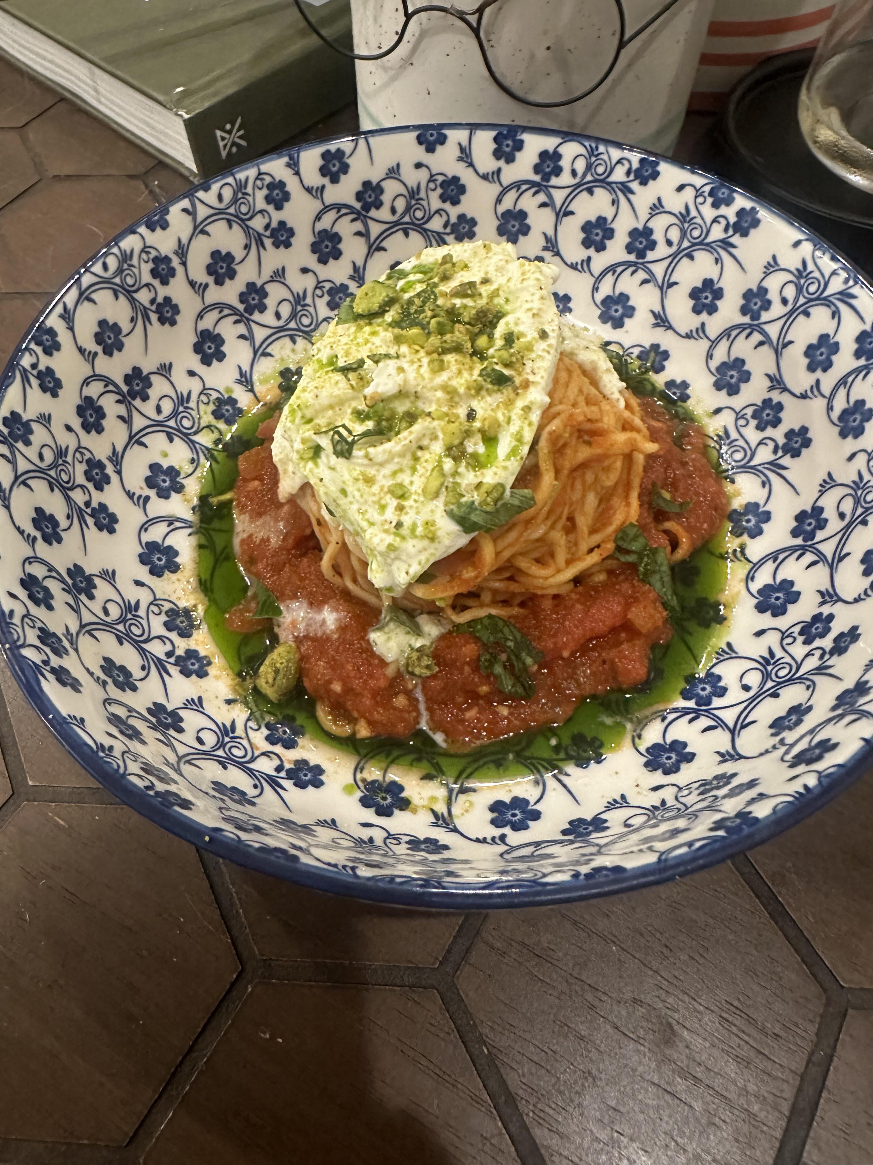Red sauce, burrata, herb oil and pistachio
