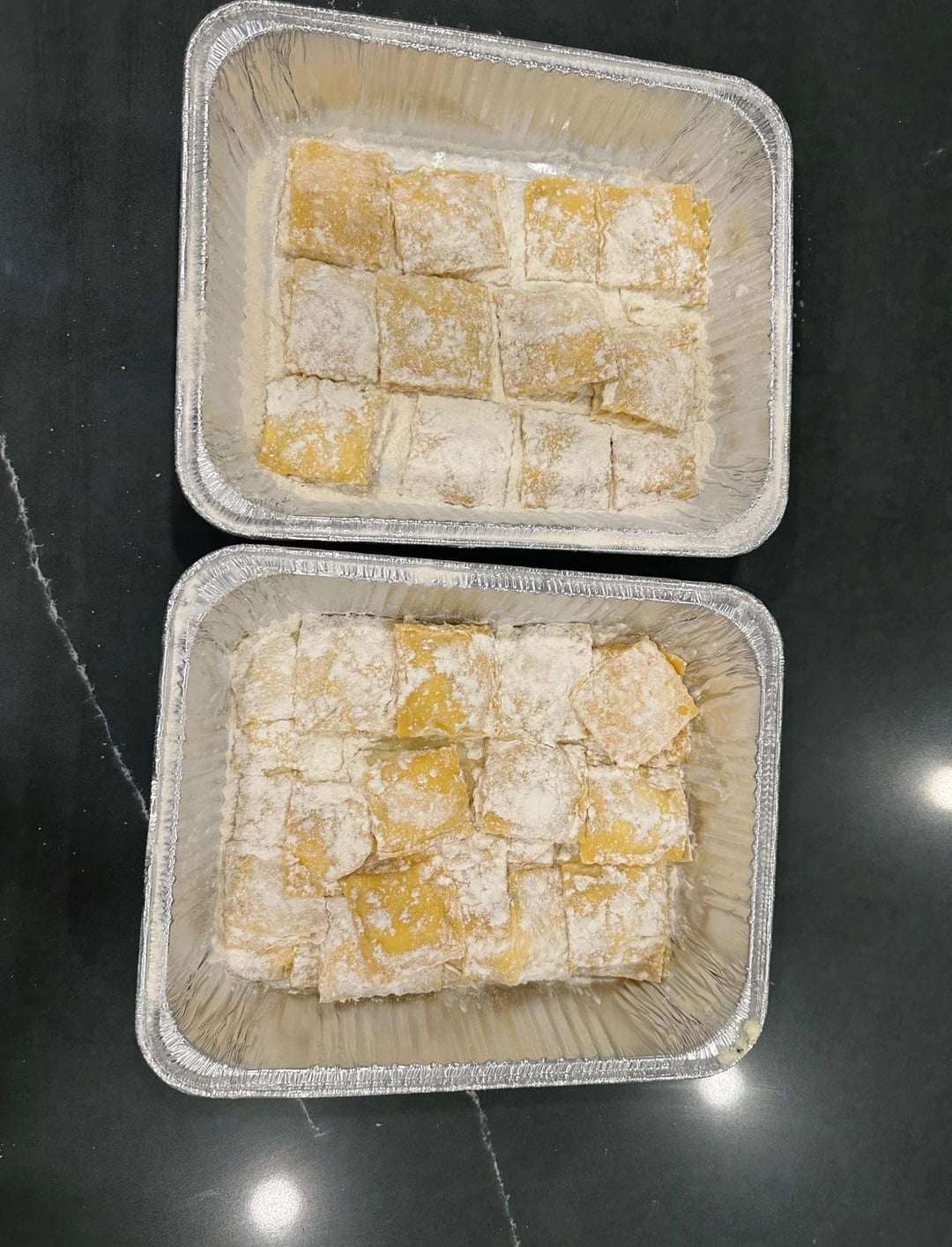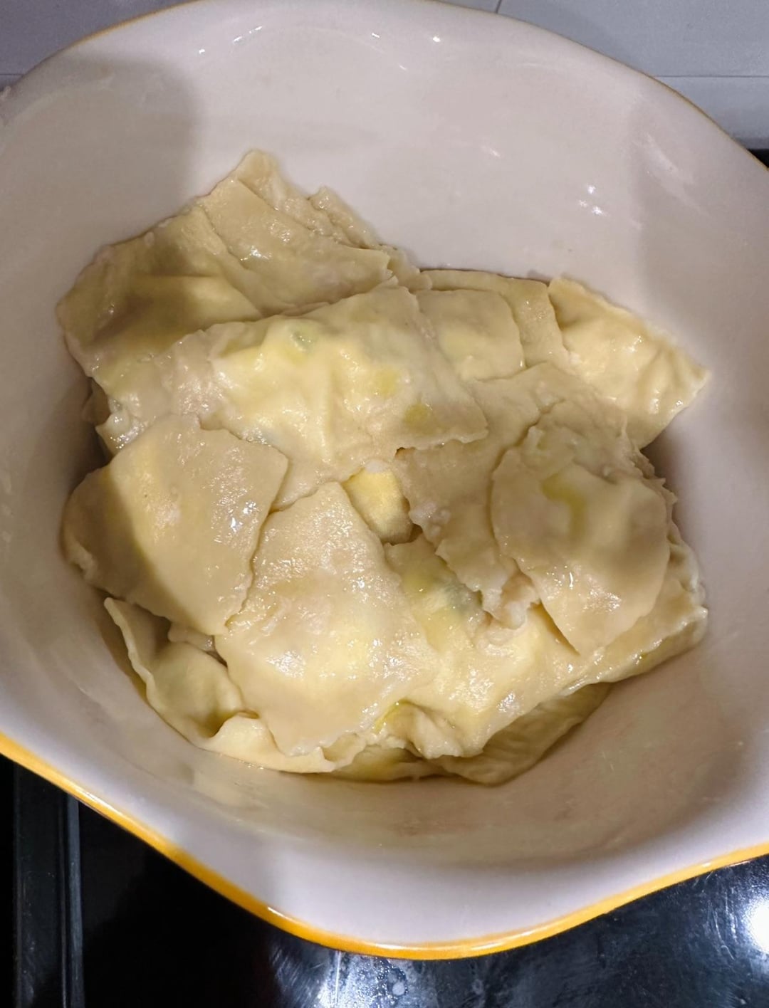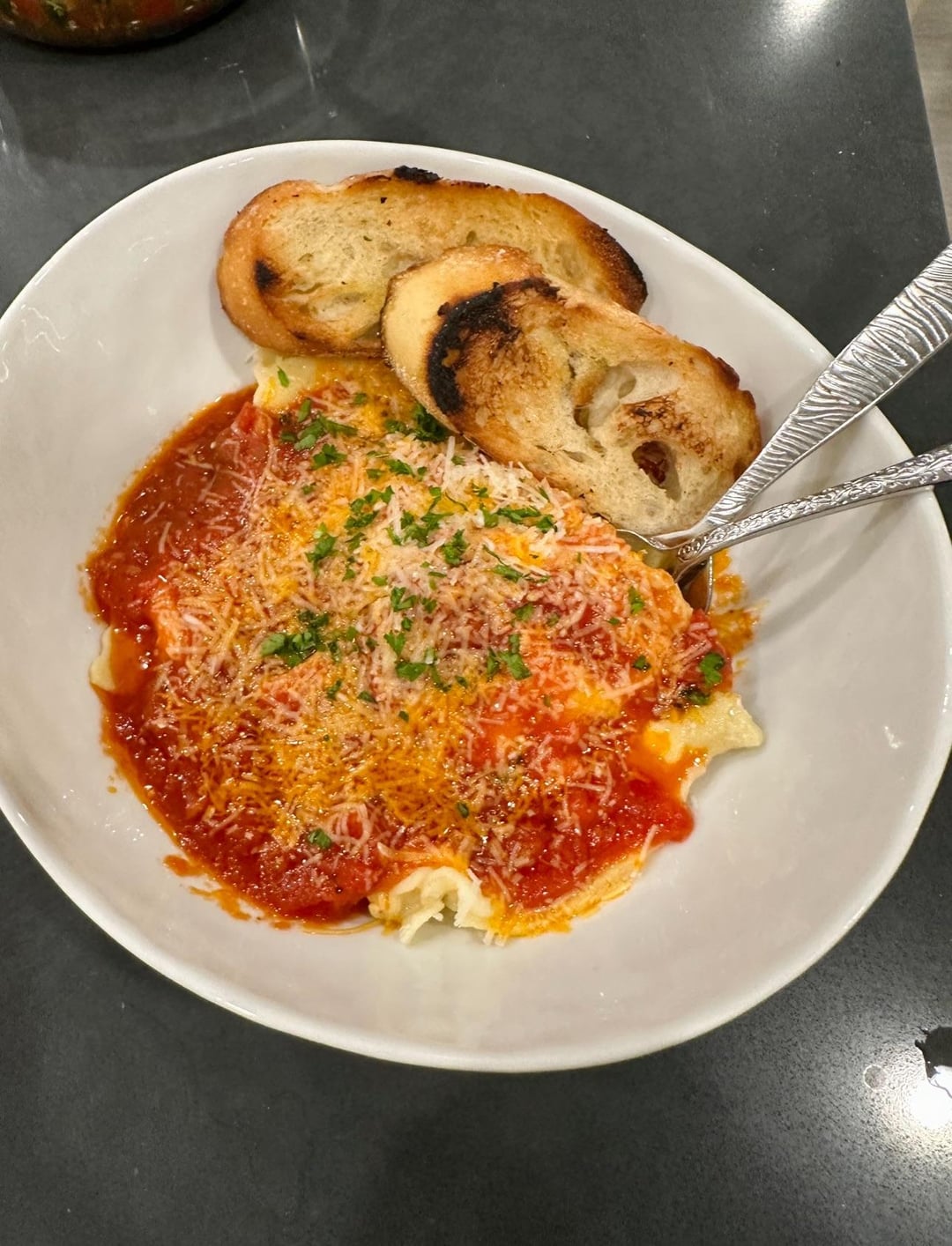 Ravioli with homemade pasta- filling of ricotta, parmigiano, parsley, and basil.