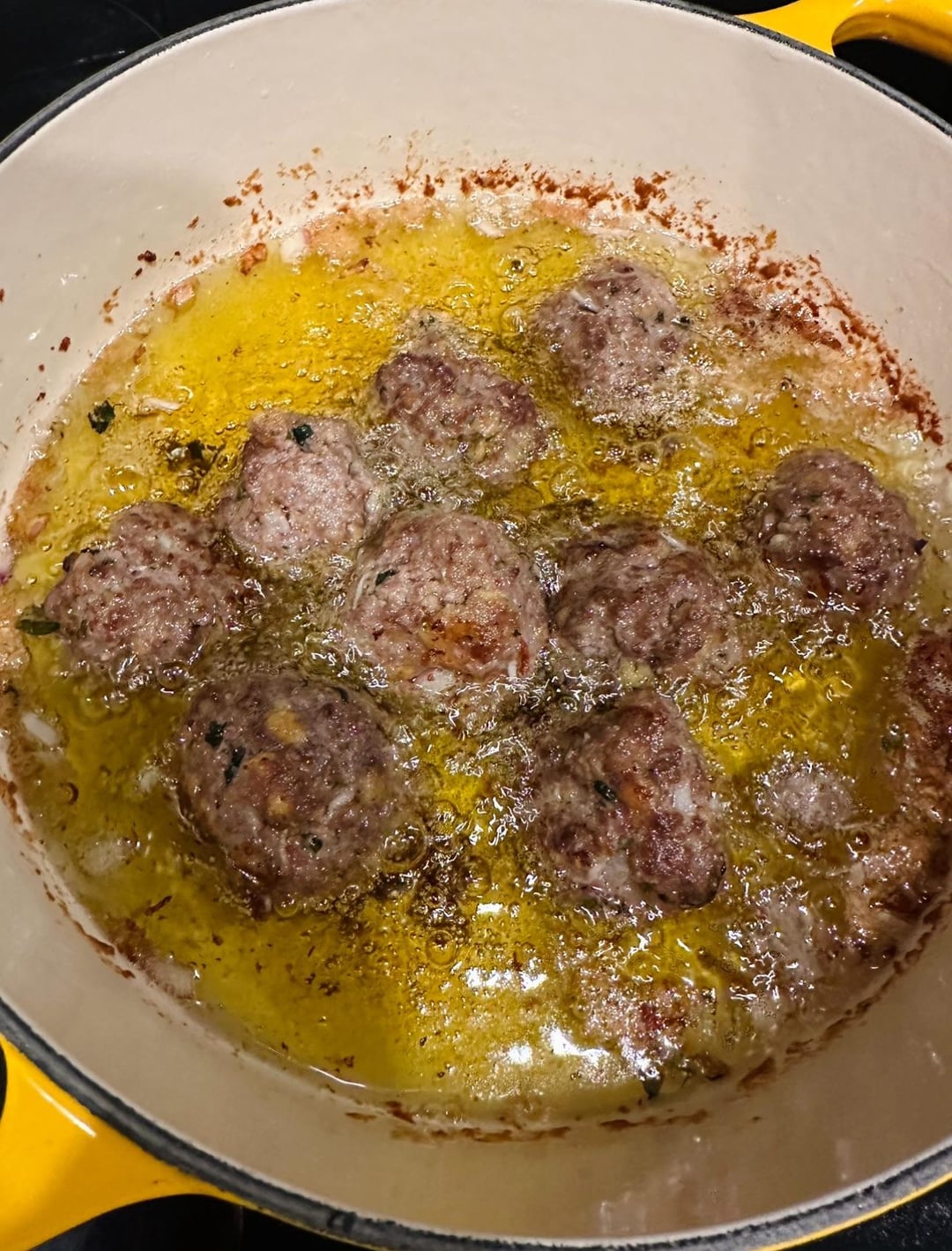 Meatballs with ground beef, breadcrumbs, milk, parmigiano, basil and parsley, olive oil, fresh garlic, and a couple eggs.