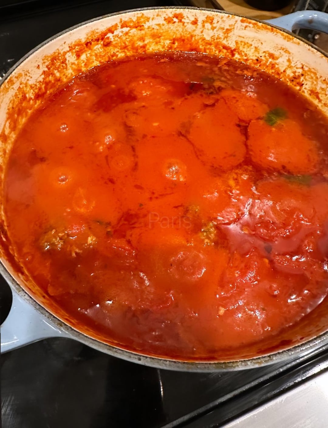 Sauce with olive oil, garlic, onion, basil, san marzano tomato, parmigiano rind, pinch of sugar, oregano, and pepper flake.