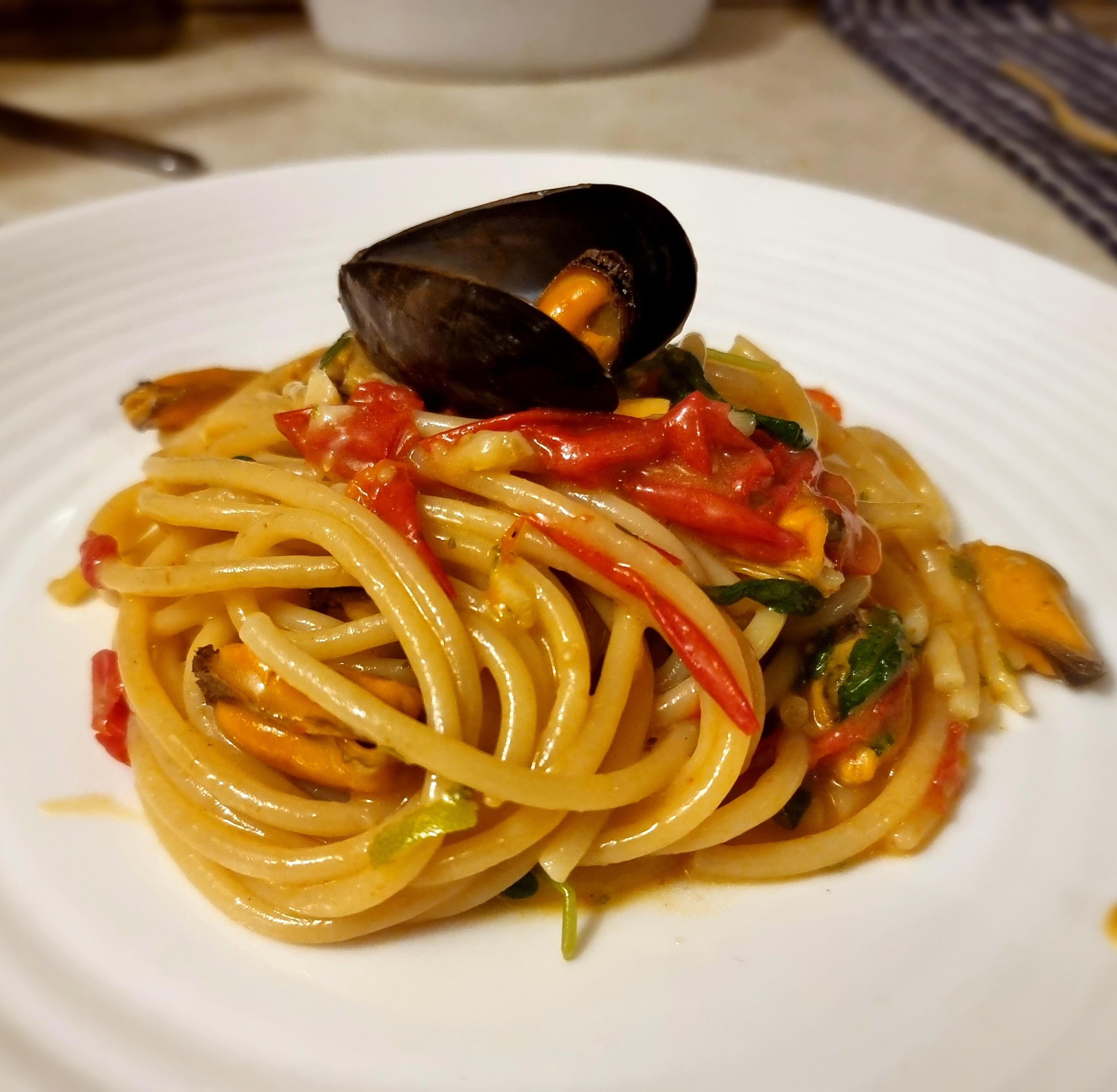 Once pasta is ready add In the shelled mussels, zest of a whole lime and the juice of half of it, rocket leaves (arugula), a glug of EVOO and toss together.