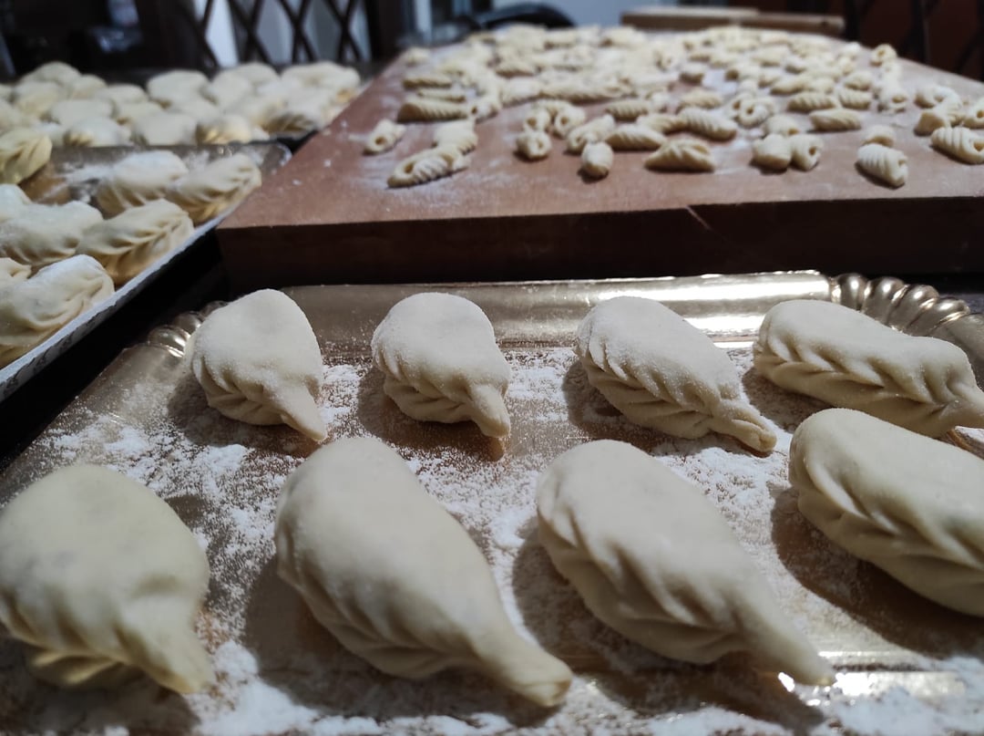 Culurgiones are a typical Sardinian dish, a sort of ravioli with a filling of potatoes, fresh cheese, and dried mint leaves and sealed with a traditional "spighitta" ("ear or wheat") closure. They can be served with tomato sauce, but to enhance the flavor just butter and pecorino cheese are enough.