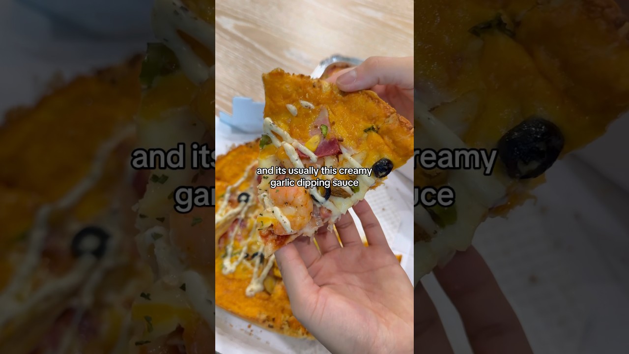 welcome to the world of korean pizza with odd pizza toppings, served with a sweet spaghetti and creamy garlic dipping sauce! would you like to try this one day?