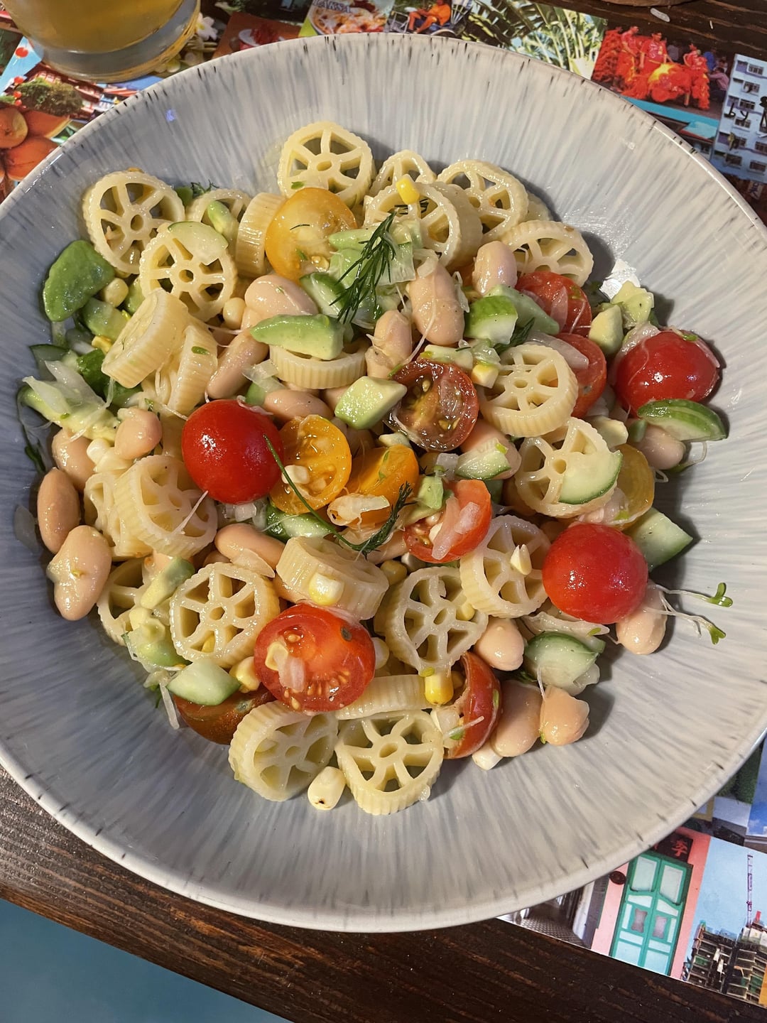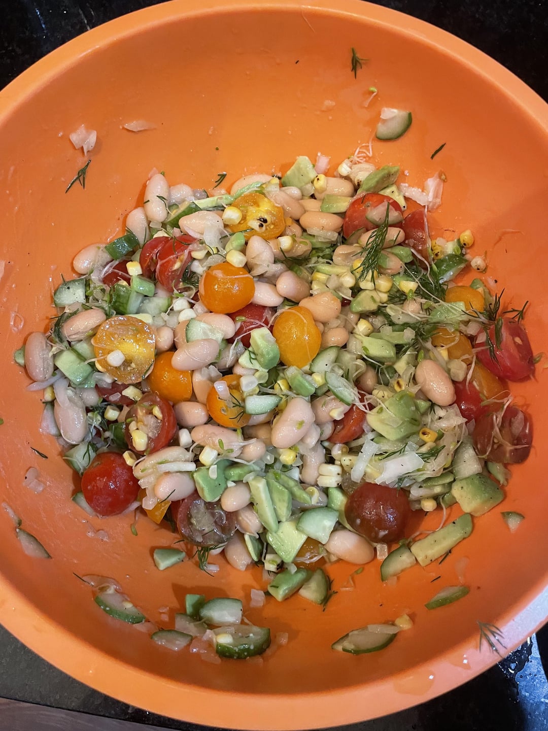 Cannellini beans, grape tomato’s, sweet corn, cucumber, avocado, alfalfa sprouts, avocado, dill. Olive oil, Lemon juice, grated garlic , salt & pepper. I regret not adding a Mustard Vinaigrette & capers or maybe some pickled vegetable.by LtBlobby Homemade DishPastaWrite A CommentYou must be logged in to post a comment.
