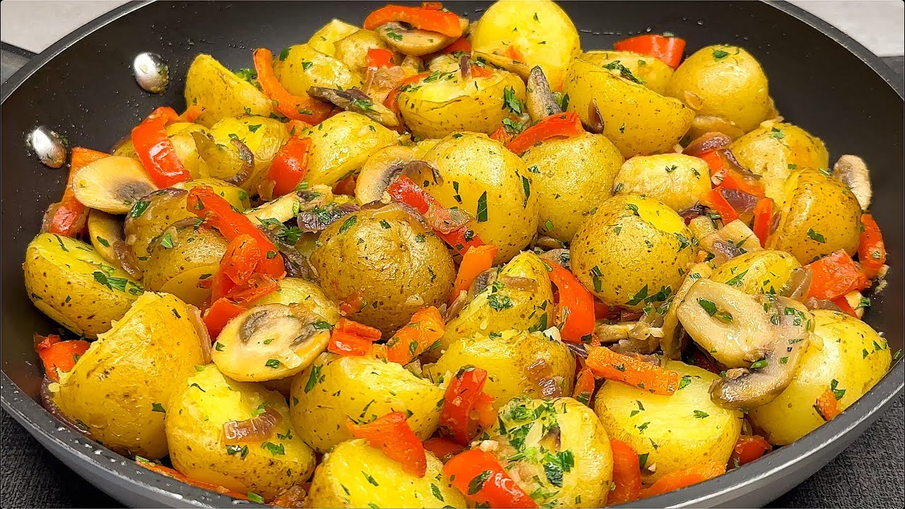 Hello friends! Today I present you a very simple and very tasty recipe. Potatoes in a garlic pan with peppers and mushrooms is a delicious and filling vegetarian dish. You can prepare it for lunch or dinner and your family will love potatoes made this way! Easy, quick and economical recipe. Try it and let me know in the comments what you think!