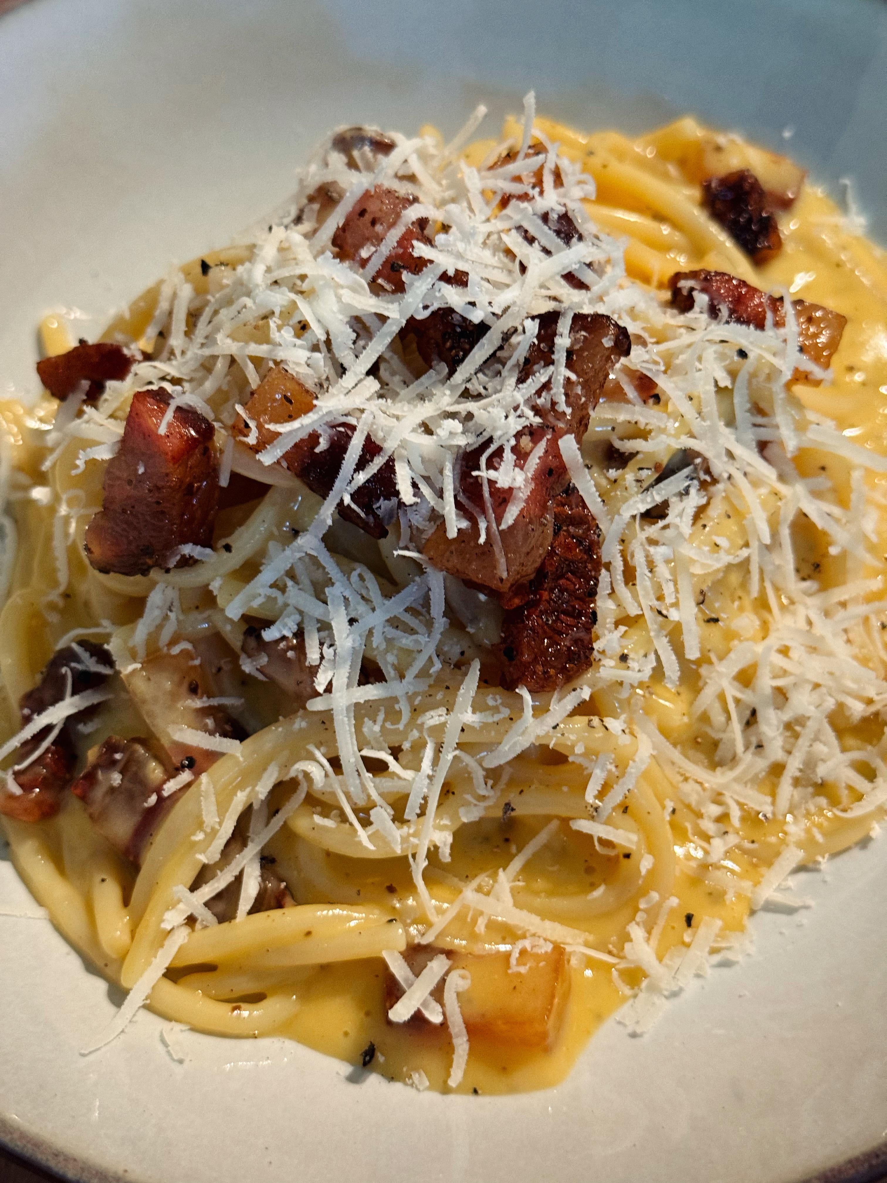with guanciale, eggs, parmegiano reggiano (instead of pecorino because of personal taste) and bronze cut spaghetti.by leitzleitz Homemade DishPastaWrite A CommentYou must be logged in to post a comment.