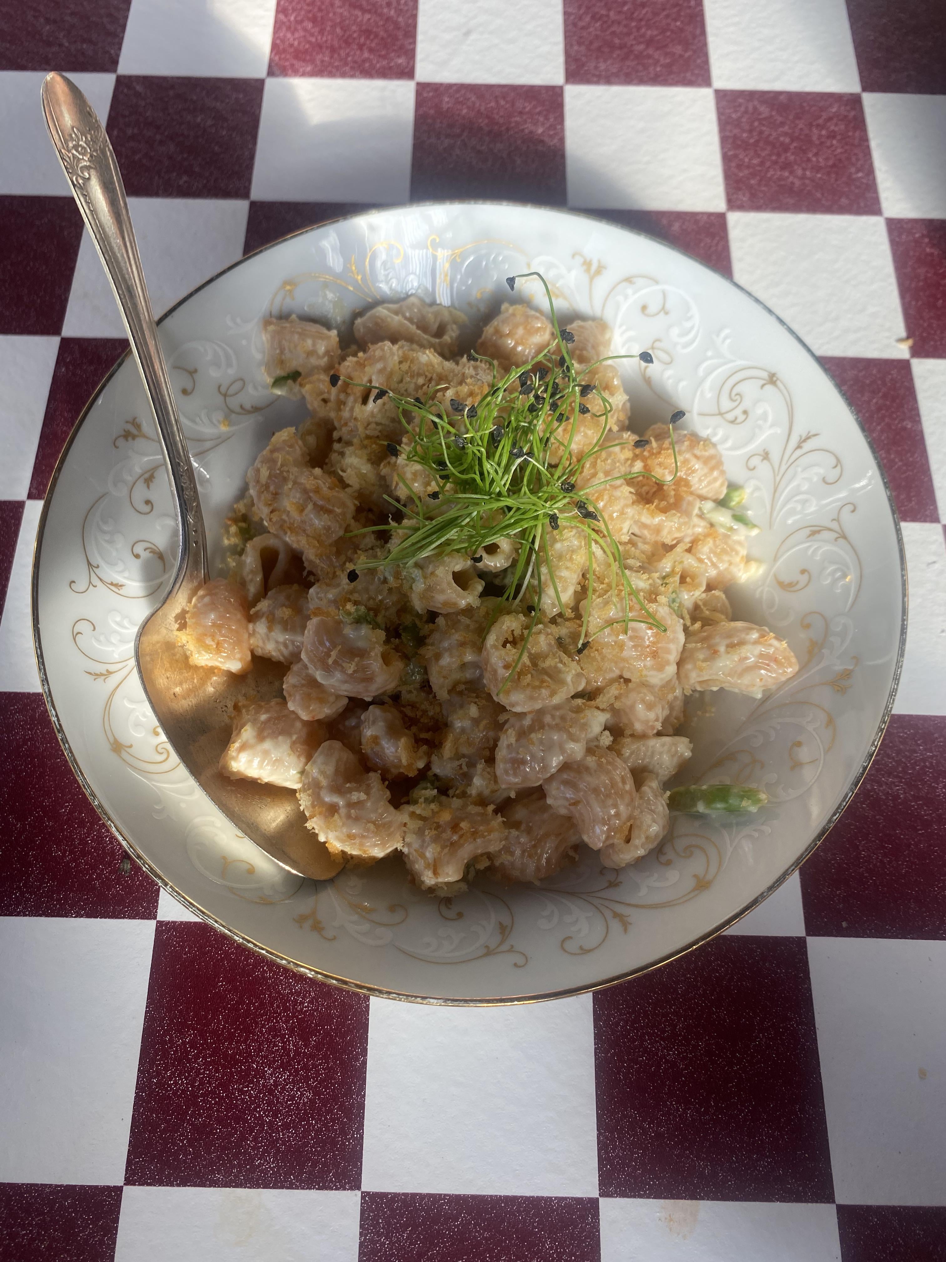 I had this green garlic lumache dish. Inside of it, it had: aleppo pepper lumache, green garlic toum, asparagus, Lemon, breadcrumbs.