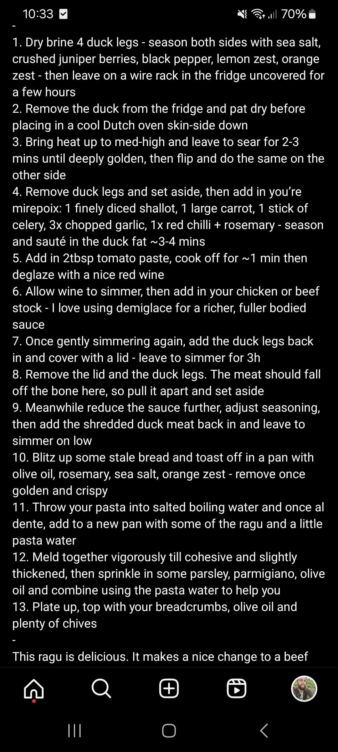 Duck ragu with Bucatiniby CakeSlapping Homemade DishPasta 7 Comments CakeSlapping 1 year ago Recipe from this Instagram channel:https://www.instagram.com/reel/C9sVksdolA0/?igsh=NjRiN3ZqdGdoYnNo alwaysbetterthetruth 1 year ago Stunning DecisionPatient128 1 year ago That looks delicious! scalectrix 1 year ago Proper. CarJealous3614 1 year ago it brings out the true colors and textures of the dish lgbtjase 1 year ago Duck rage is an interesting choice. I’m not a huge fan of duck, but I’d definitely give this a try. Early-Pin-8772 1 year ago The ultimate comfort food. Yum!Write A CommentYou must be logged in to post a comment.