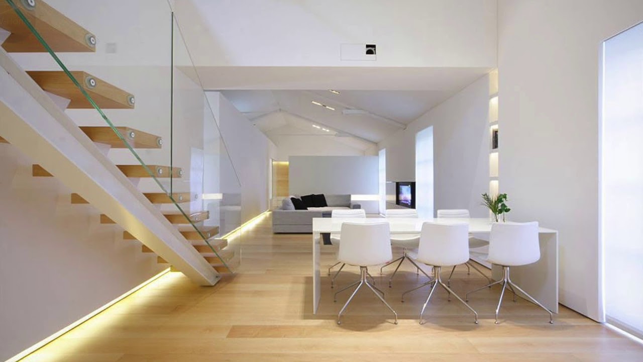 When an old monastery located around the city of Como, Italy, was being remodelled and converted into a residential complex, two adjacent units have been connected to form this duplex apartment. The shape of the original units is clearly enhanced by the different pitched ceiling direction as well as by their different heights. The main idea was to keep the shell intact, maintaining the entire length of the unit open and invading the space minimally.