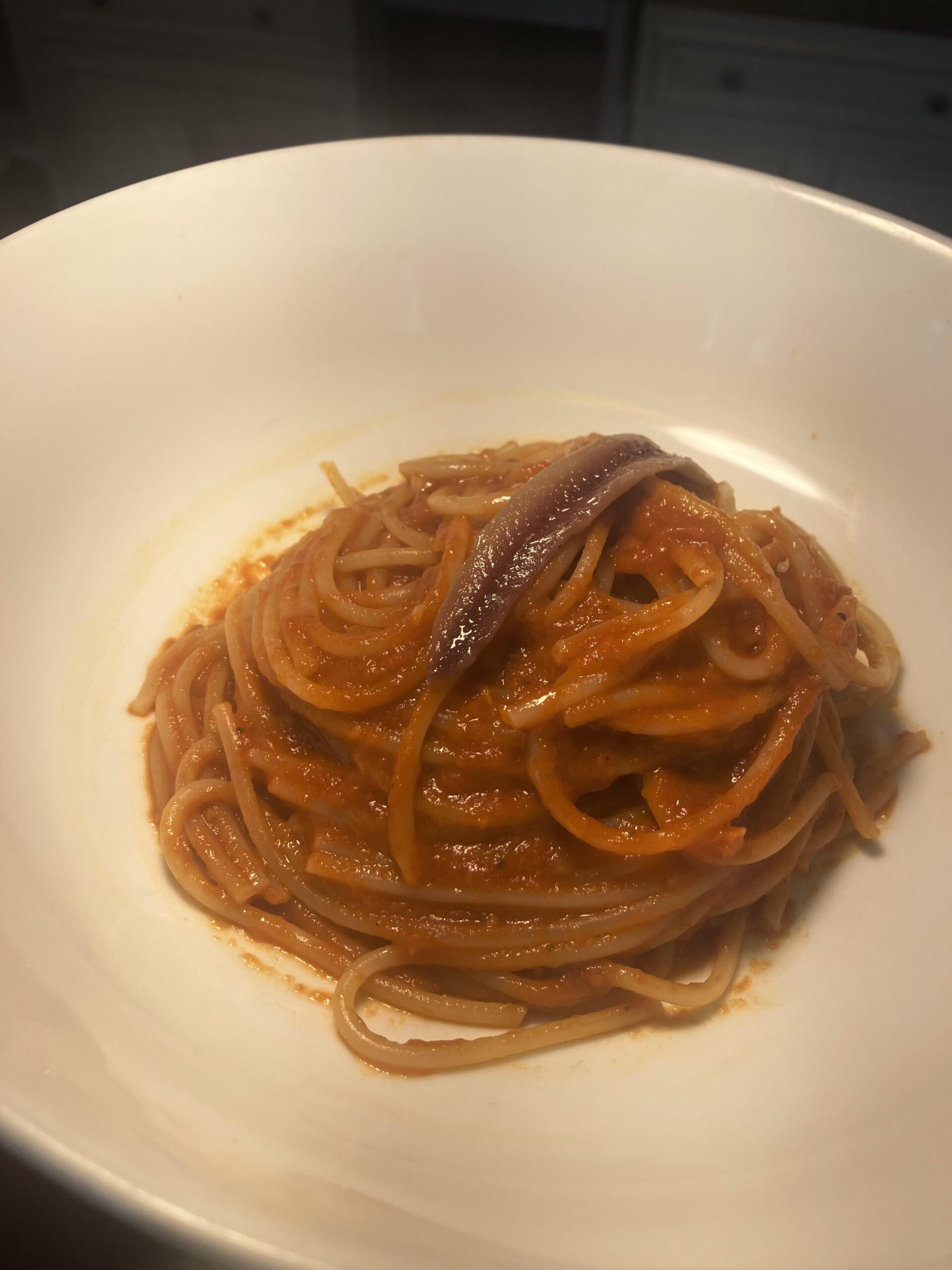 Pomodoro sauce with anchovies and peperoncino infused EVOO