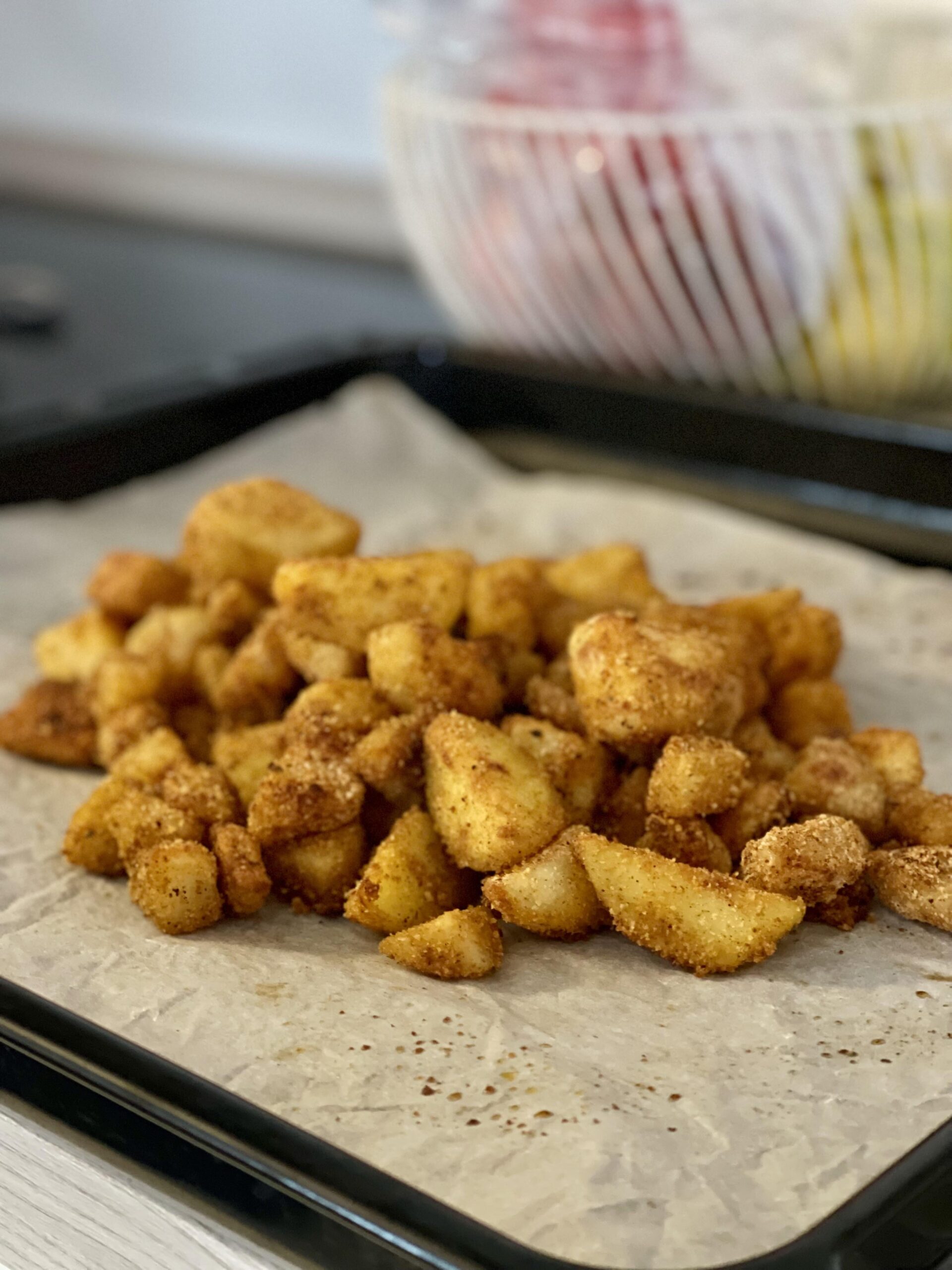 When I have a craving for potatoes I like to make them like this: I peel the potatoes, let them soak and then boil them for 5 minutes. Then I let them cool and in the meantime I prepare a breadcrumb coating with breadcrumbs, parmigiano reggiano, paprika, garlic, oregano, salt…. I put the potatoes in the breadcrumbs, a little extra virgin olive oil and then bake them in the oven at 190/200 degrees for 35 minutes.