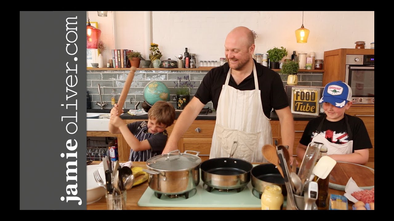 Jamie’s website editor Jim gets his boys into the kitchen to help him make meatballs with spaghetti in a fresh tomato sauce. This is a great recipe to get kids helping mum or dad in the kitchen. Loads more for kids at www.JamieOliver.com