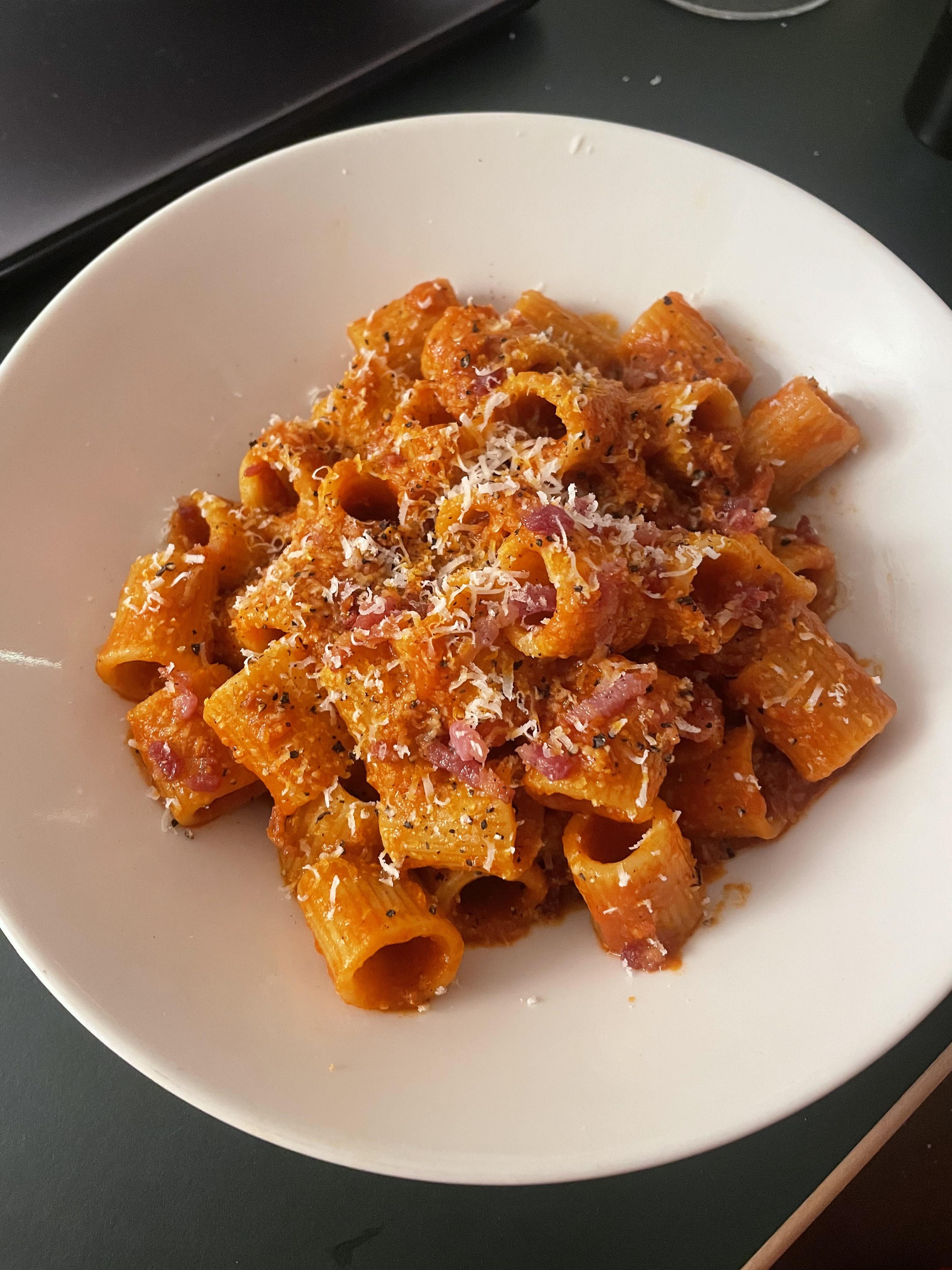 Start by frying 200g of bacon cubes (ideally guanciale) without any oil until crispy. The bacon will release enough fat on its own. Remove bacon and add 400-500g of passata and reduce. Add salt and black pepper to taste. Boil pasta and just before al dente toss into sauce, emulsify with pasta water and parmigiano reggiano (even though pecorino is being traditionally used), add bacon back in and reserve some for garnish.