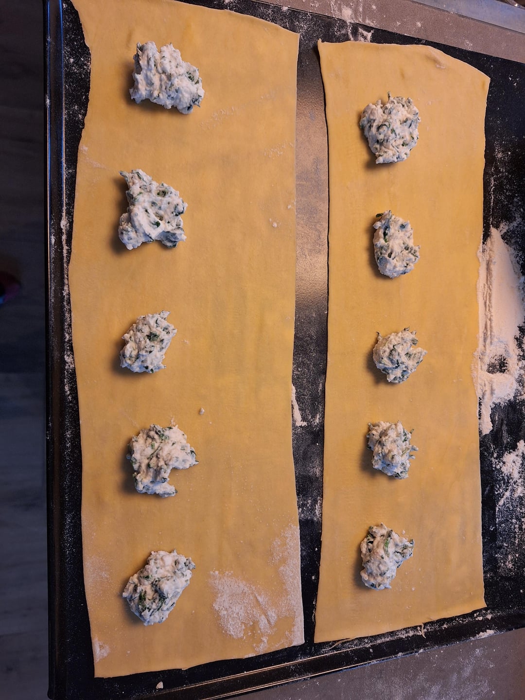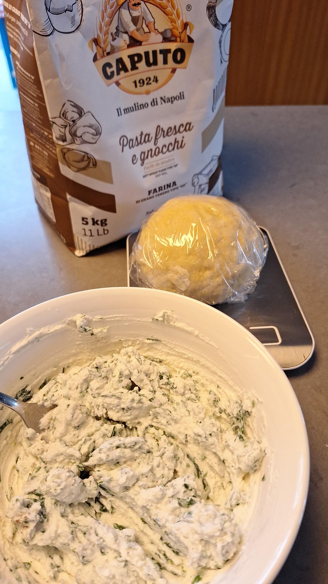 Filling is made of ricotta, parmagiano reggiano, spinach, pepper, salt, garlic and nutmeg.