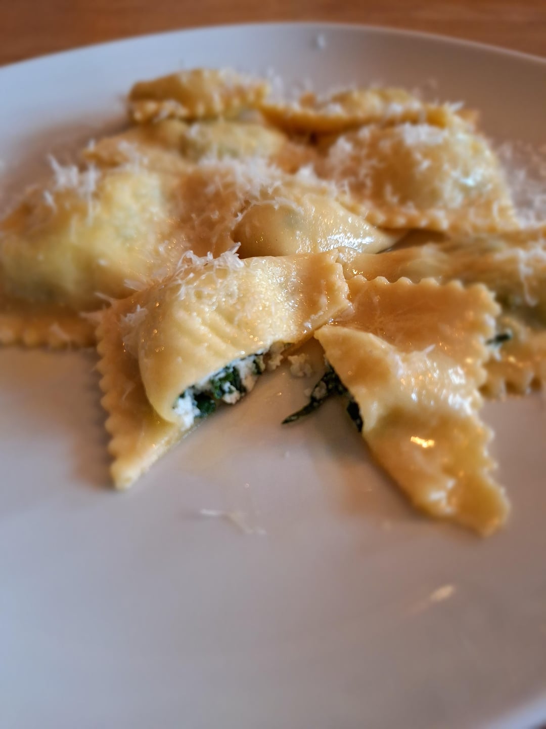 After boiling the Ravioli is tossed in brown butter and served with Parmagiano reggiano.