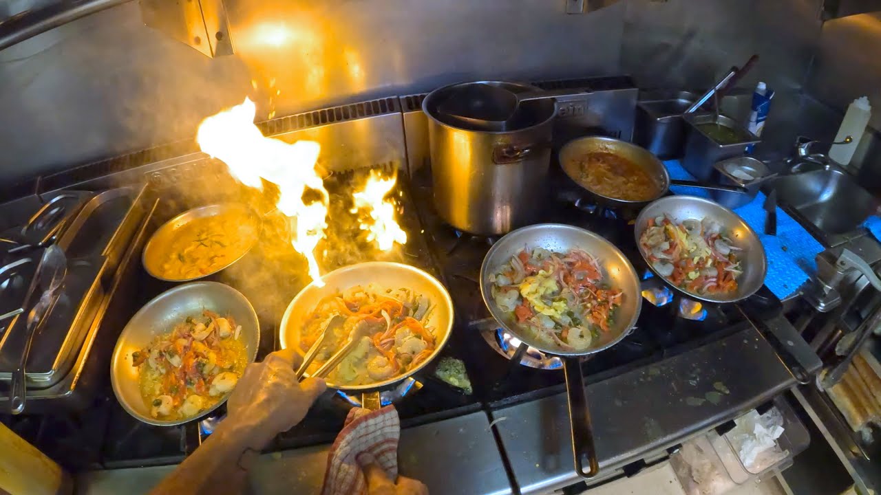Tight kitchen but perfect, great synergy in this crew . Beautiful presentation on those plates chef. At 22:40 those orders come in😳