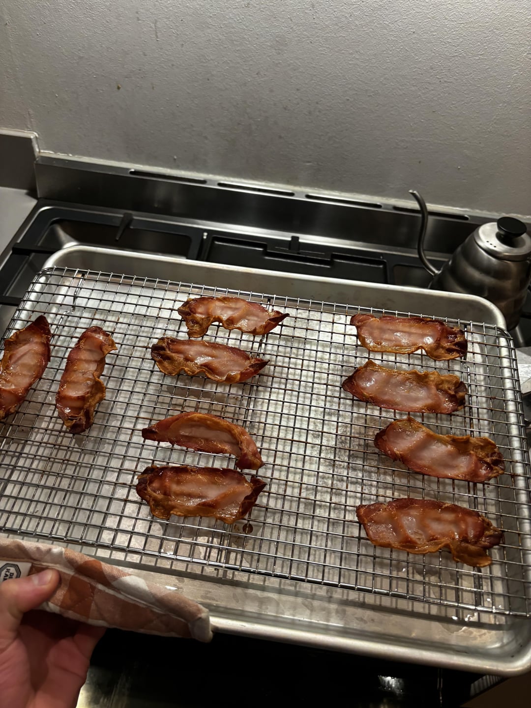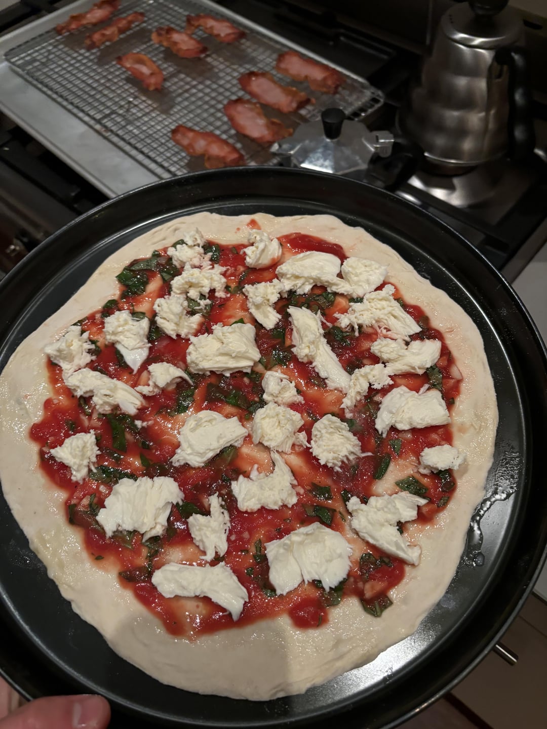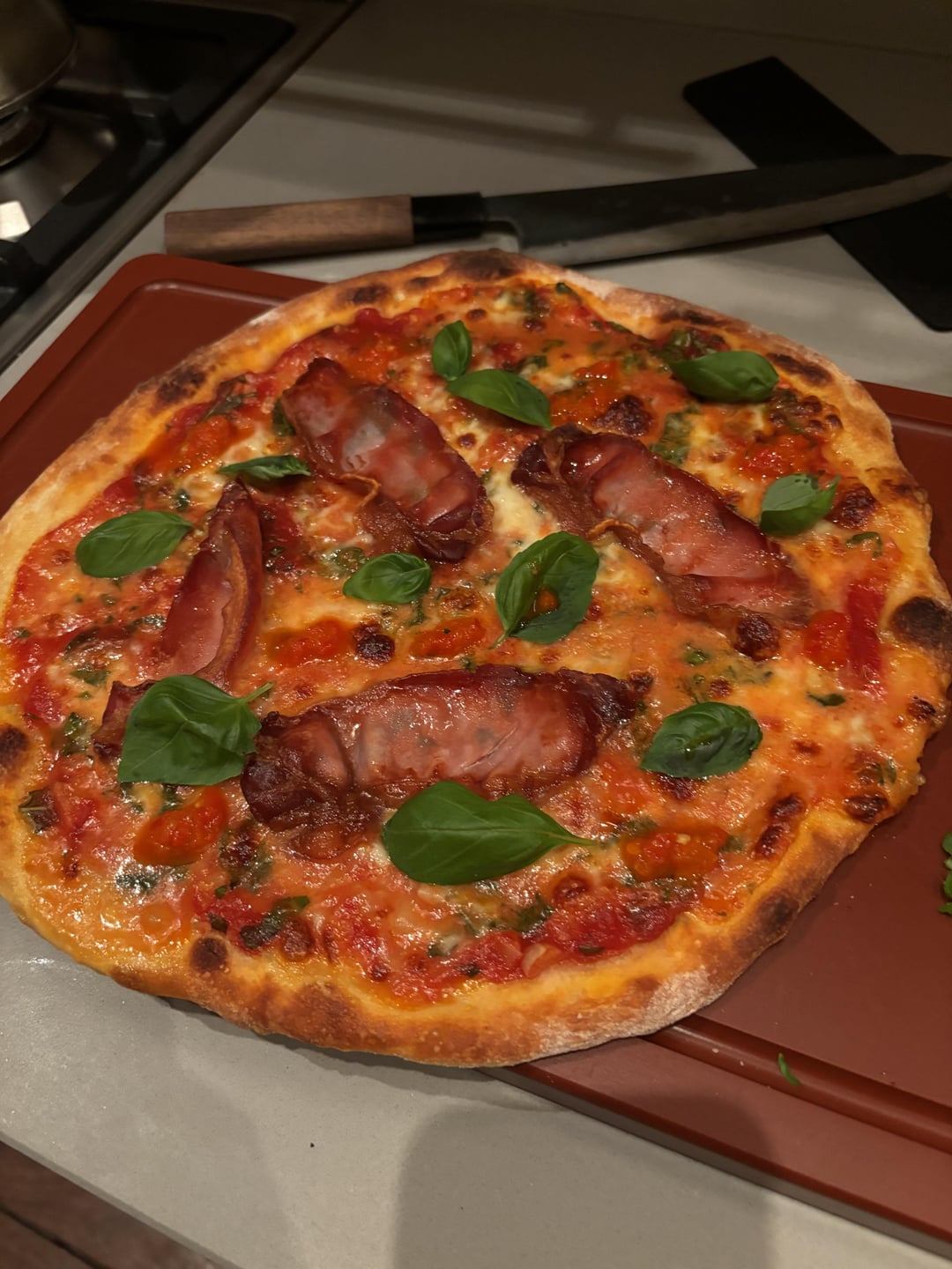 Noob here, so any positive criticism or tips are greatly appreciated! The pizza itself is a dough I picked up from a local pizza place, with homemade tomato sauce, mozzarella and topped with bacon and harissa paste:)
