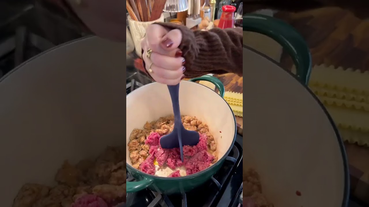 Lasagna Soup using the @Tramontina USA 7Qt Enameled Cast Iron Dutch Oven in the color basil. Cozy on up with a bowl of comfort this season. Ingredients 8-10 Lasagna Sheets broken into pieces 1/2 lb Ground Beef 85/15 1/2 lb Italian Sausage 4 cloves garlic minced 1 Medium Yellow onion chopped (~1 Cup) 1 Medium sized Carrot small diced (~1/3 Cup) 2 Stalks Celery small diced (~1/3 Cup) 12 oz. Cherry Tomatoes Halved 4 Tbsp Tomato Paste 1/2 Cup Dry Red Wine 24 oz. Passata or Tomato Puree 14 oz. Can of Crushed Tomatoes 1 Cup of water (from the tomato jar) 4 Cups Chicken Stock 1 Cup water (optional-to thin out the soup) 3/4 Cup Freshly Grated Mozzarella Cheese 1/4 Cup Freshly Grated Parmesan Ricotta cheese for topping Parmesan Rind 2 Bay Leaves 1 Sprig Basil 1 tsp Italian Seasoning Pinch of Red Pepper Flakes Salt and Pepper to taste Olive Oil Using the Tramontina 7Qt Enameled Cast Iron Dutch Oven on medium high heat, add enough olive oil to coat the pan (~1-2 Tbsp). Once heated brown the sausage and ground beef. Wait 3 minutes before stirring. Season with salt and pepper Once fully cooked remove from the pan and place onto a paper towel lined tray and set aside. In the same pot on medium heat add onion, celery and carrots. Season with a pinch of salt, pepper, Italian seasoning and a red pepper flakes. Stirring occasionally cooking for 7 minutes until celery and carrots are tender. Add garlic, cook for 1 minute until fragrant. Add meat back into the pot. Stir together. Add tomato paste, cook until bright red turns a rust color (2 minutes). Add in cherry tomatoes, stir. Pour in red wine, simmer until wine is completely cooked out. Add in parmesan rind Pour in crushed tomatoes and passata. Taking 1 cup of water into the tomato jar and then pouring into the pot. Add chicken broth. Bring to a simmer. Once simmering add 2 bay leaves and a sprig of basil. Cover and simmer for 15 minutes. Uncover, remove basil, bay leaves and parmesan rind. If soup is too thick add in an additional cup of water. Add in broken lasagna pieces. Stir. Cover and simmer until pasta is al dente (follow package instructions). Once pasta is cooked, over low heat stir in mozzarella cheese and freshly grated parmesan. Serve in bowls with a dollop of ricotta cheese, fresh cracked black pepper and a sprinkle of fresh parsley. #tramontinaUSA #tramontina #lasagnasoup #lasagna #fallrecipe #soupseason #comfortfood #easyrecipe #yum