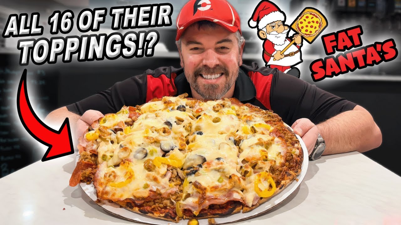 American pro eater Randy Santel versus Fat Santa’s 16-Inch Pizza Challenge hosted by Fat Santa’s Pizza & More in Santa Claus, Indiana!! I kicked off the new year 2025 by attempting restaurant food eating challenges all around southern Indiana and the state of Kentucky. For competing eating food challenge #1 of many, since we just all recently celebrated the Christmas holiday season, I headed up to Santa’s Pizza & More in Santa Claus, Indiana so I could attempt their huge and delicious 16-Inch “Fat Santa” Pizza Challenge!! I had just 30 minutes to eat a giant 16″ diameter pizza loaded up with all 16 of the toppings available on their pizzas. There were at least seven meats: chicken, ham, bacon, ground beef / hamburger meat, sausage, pepperoni, and Italian sausage. There were also lots of healthy vegetables and even fruits such as mushrooms, green pepper, green olives, black olives, pineapple, onions, tomatoes, and more. Lots of mozzarella cheese smothered all the meats and other toppings, and I was trying to finish the whole 6lb pizza within the 30 minute time limit. Winners earn the $28-$30 pizza free plus a sweet t-shirt and spot on Fat Santa’s Wall of Fame!! BIG thanks to the everyone with Fat Santa’s Pizza & More in Santa Claus, Indiana for the wonderful food, drinks, ice cream dessert offer, and hospitality!! Special thanks also to all my friends who came up that Thursday evening to watch and meet me!! I appreciate everyone in the Santa Claus area and all around Indiana who watches videos and supports our hard efforts!! There are lots more man vs food restaurant eating challenge videos upcoming!!