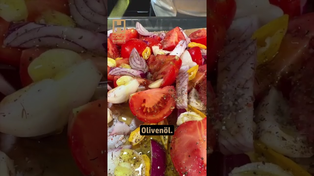2. Tomaten vierteln und mit Zwiebelstücken, Knoblauch und Chili auf ein mit Backpapier ausgelegtes Backblech geben. Alles mit Gewürzsalz und Pfeffermix würzen und das Olivenöl darüber geben. Backblech ca. 20 Minuten im vorgeheizten Backofen rösten.