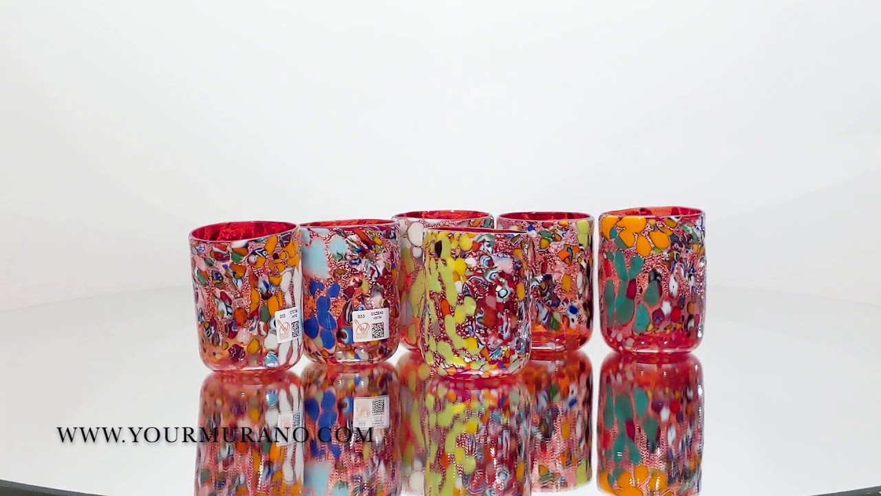 Set of typical Murano glasses, inspired by the traditional “Goti de fornasa”, with orange glass, murrine and silver leaf details. These hand-crafted artworks, realized by expert glassmakers, are the perfect decorative elements for your house, or a unique way to add color to your dinner parties!