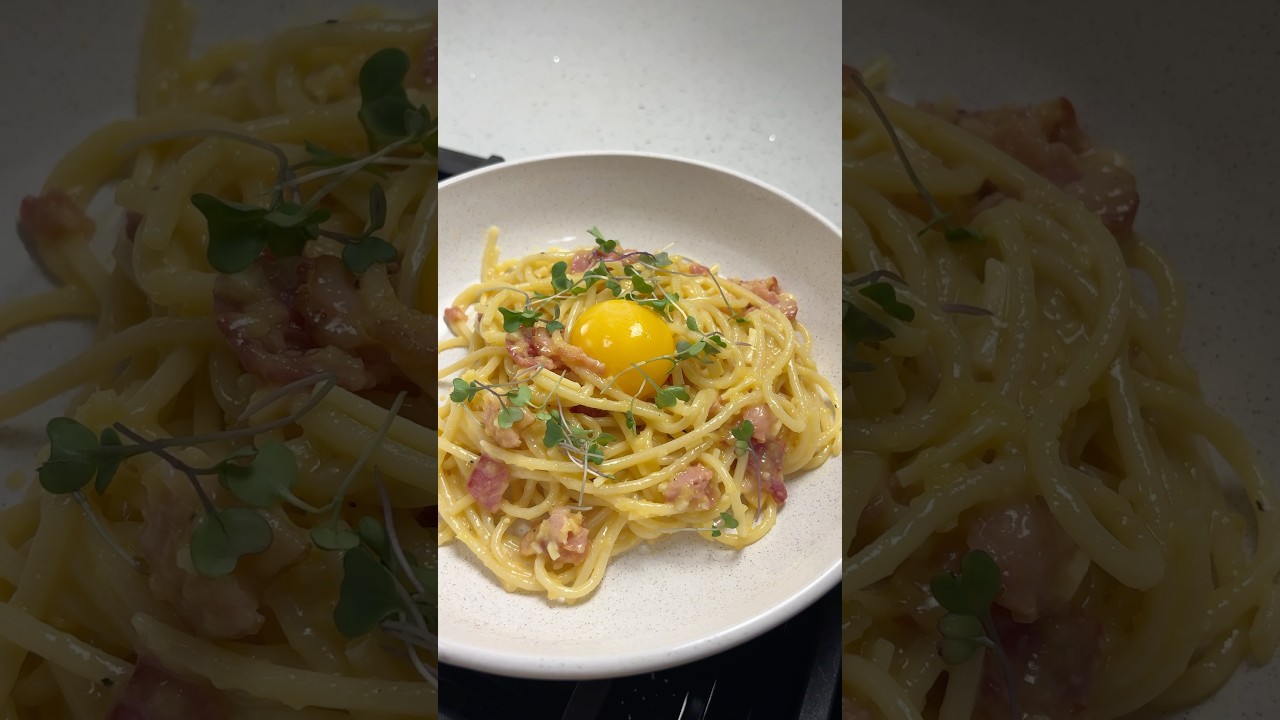 Ingredients: pasta, bacon, egg yolk, Parmesan cheese, black pepper, salt.